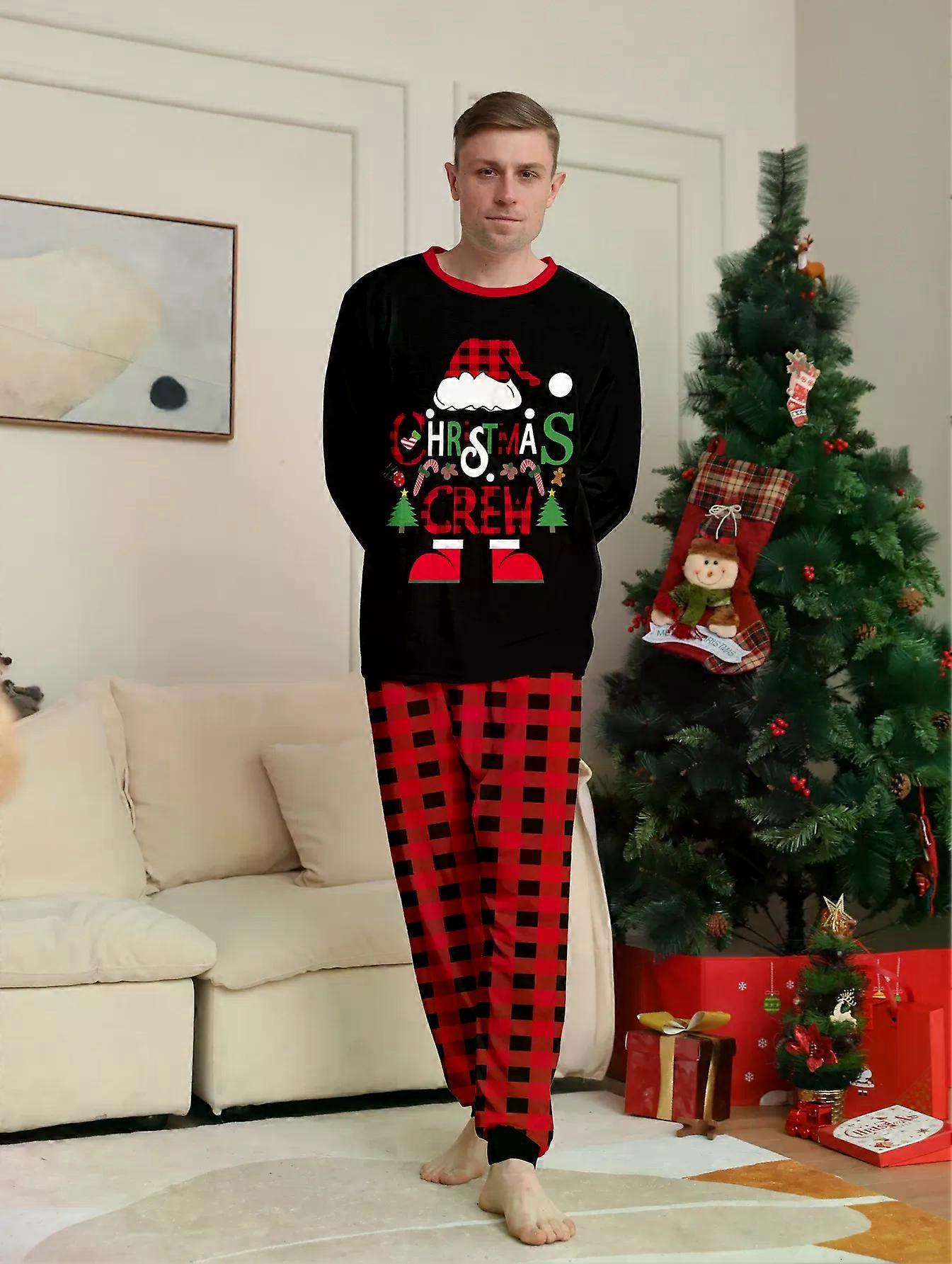 Christmas Couple Pajamas Set: Black Tops with 'Christmas Crew' & Santa Hat Print, Red - Black Plaid Pants