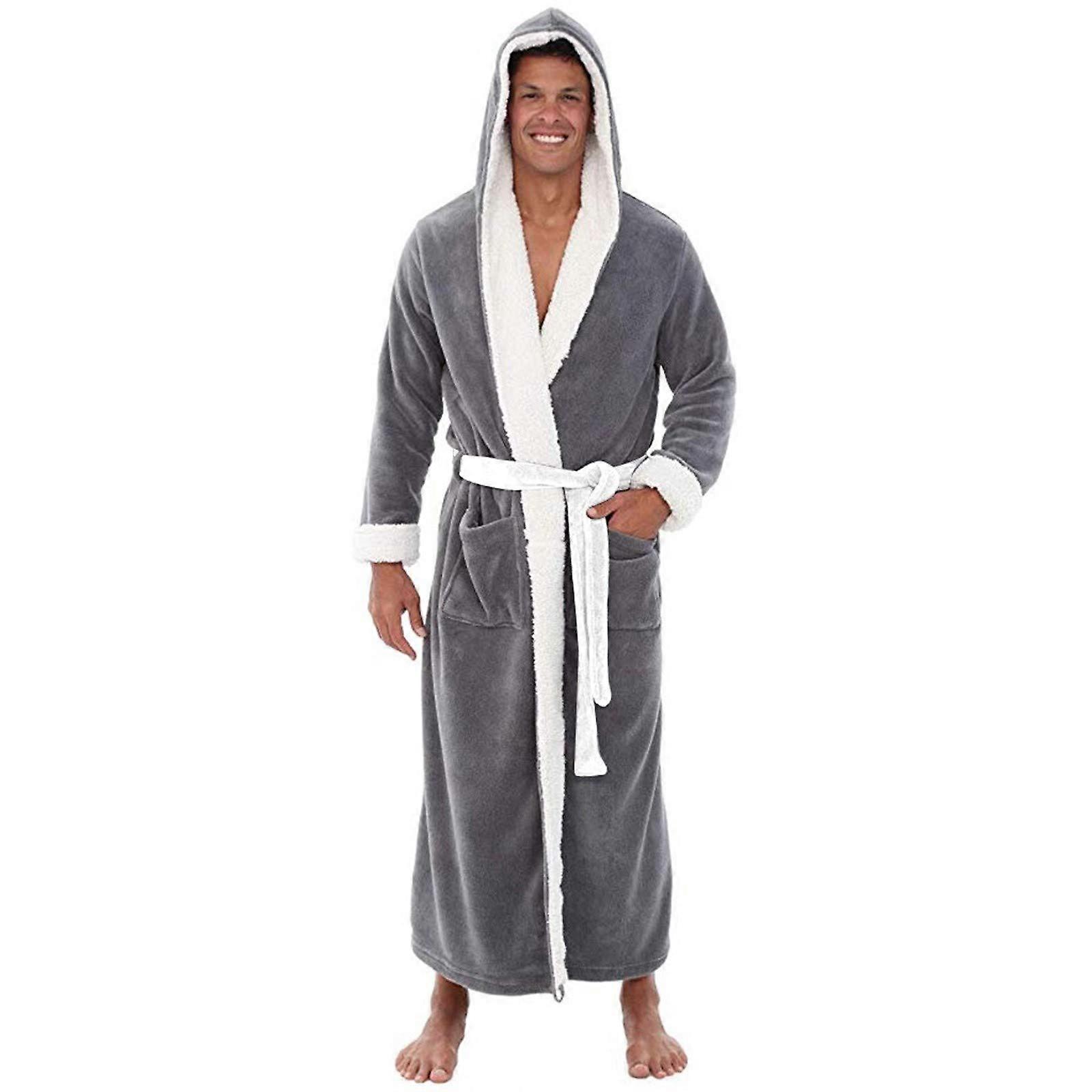 Men's Terry Towelling Bathrobe With Hood Absorbent Sauna Gown Long Sleeve Belt Loops Patch Pockets Gray Size S