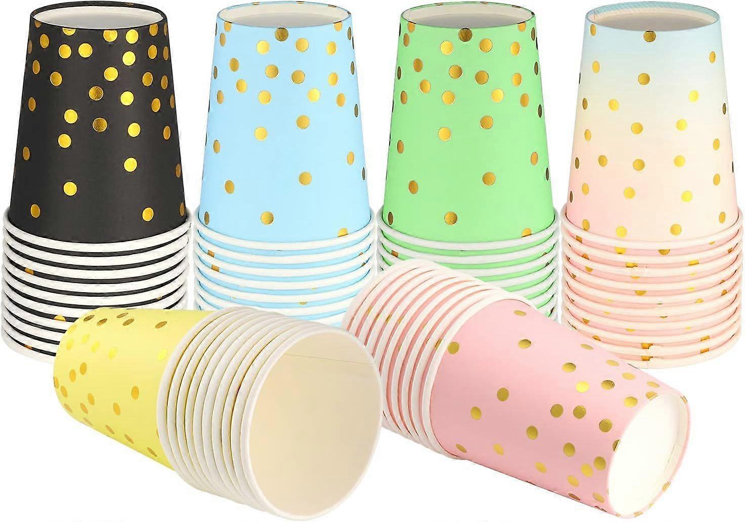 PREMIUM MATERIAL - These disposable cups are made of high-quality, safe, and eco-friendly food-grade paper. They are sturdy and won't easily deform, making them ideal for both hot and cold beverages. These paper cups are perfect for cold drinks like sodas, juices, and more. ELEGANT DESIGN - The paper cups feature a sleek and modern black design with gold accents that complements your decor and will impress your guests, making your party memorable and unforgettable. SPILL-PROOF DESIGN - We've increased the thickness of the product and optimized the production process. Forget about leaks, spills, and smelly paper cups. Our cups are designed for any type of celebration. These premium paper cups are ideal for offices, parties, birthdays, weddings, or special events. Paper cups make cleanup a breeze. OCCASIONS FOR USE: These paper cups are ideal for various parties, such as birthdays, baby showers, and other events. They can also be used for crafts, such as painting flowers, trees, and other designs. Let your imagination run wild! VALUE PACK: Each pack contains 60 9 oz (266 ml) paper cups. Product size is 7.5 x 5.3 x 9 cm. Enough for parties and crafts.