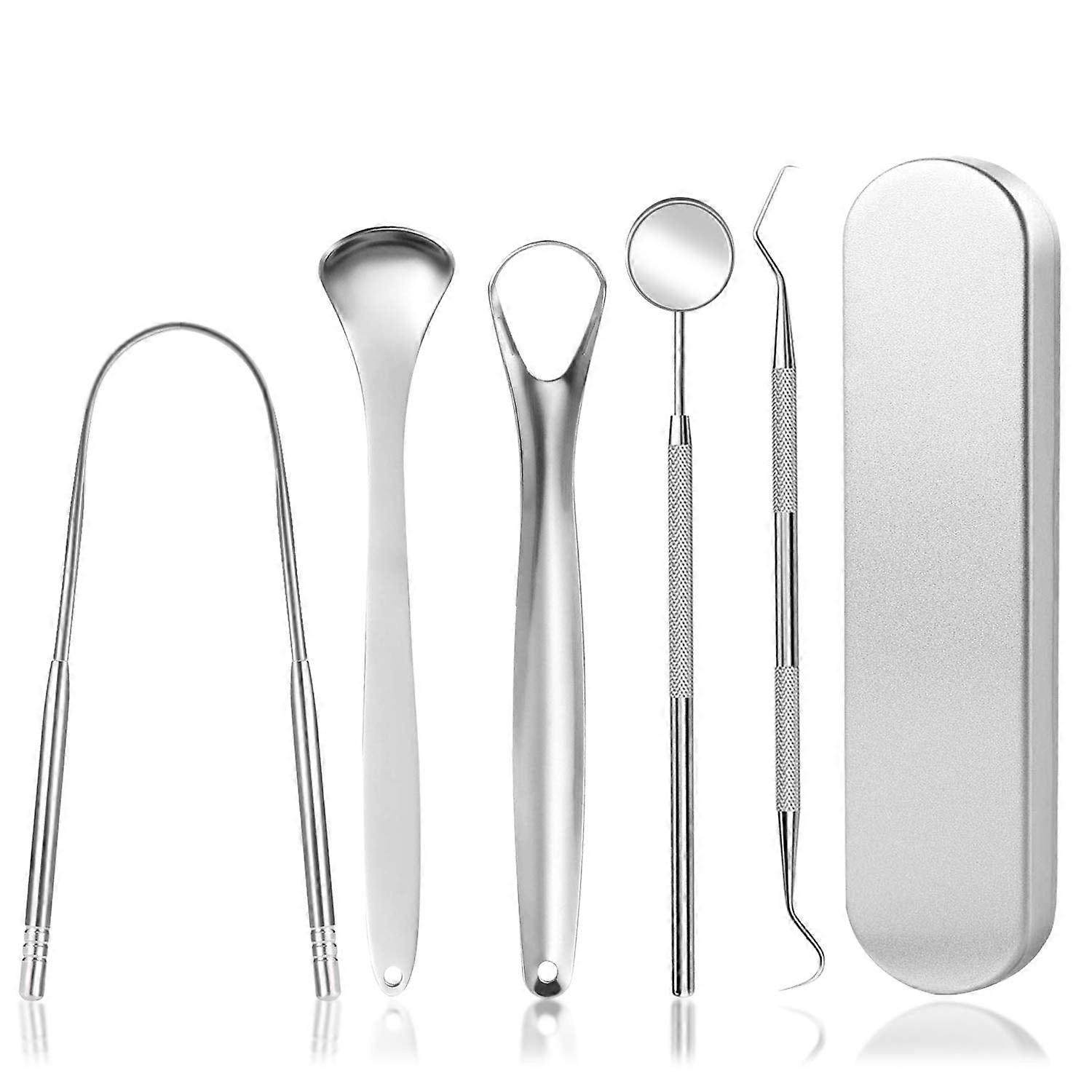 The main cause of bad breath is dirt on the tongue. Material: stainless steel Package size: 17.8 * 6 * 1.8 CM Color: silver Easy to use: Ergonomically designed, two types of tongue brushes clean every corner in seconds and are easy to clean after use. Use: Use either "U" shape to remove any dirt according to the condition of your tongue, and then use "Spoon shape" to care for the part you care about. We recommend using 2-3 times a week. After use, you can wash it with water. durable:Tongue Cleaner Tongue Cleaner, made of high quality stainless steel。Thickened tongue scraper edges can clean dirty residue Enjoy oral :helps maintain a clean tongue every day, Remove any dirt that may be on your tongue and your breath will feel fresh, ready to face your daily activities. Travel Case for Your Convenience: Included a travel carrying case in the package for multi-place using, such as home, work, school, trip, camping or any other situation. Storing case:Storage case with a simple and stylish design, easy to carry. Length 6.9in *、 Width 2.3in、 Contents: 1 * U-shaped tongue cleaner, 1 * Spoon type, 1 * Open type, 1*dental probe,1* mouth detail mirror,