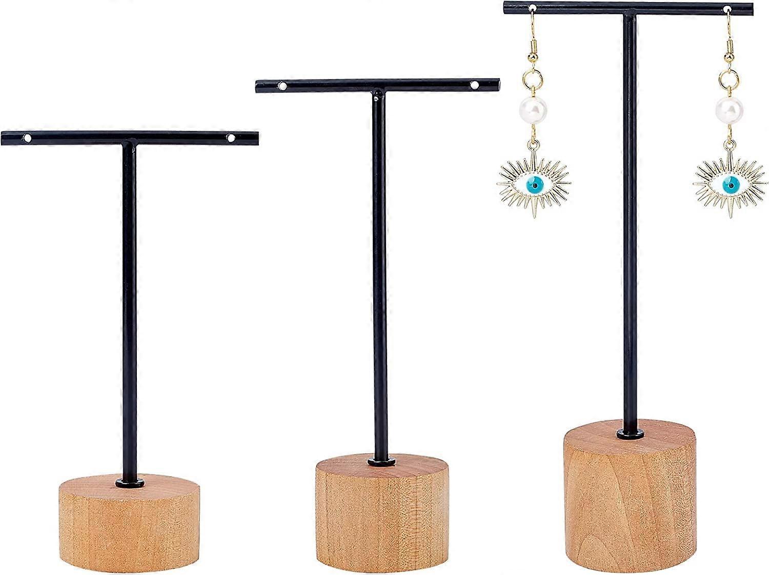 Black Metal 3 Pcs T Bar Earring Display Stand with Wooden Base, Jewelry Holder for Store, Retail, Photography Props [Black, Round Base]