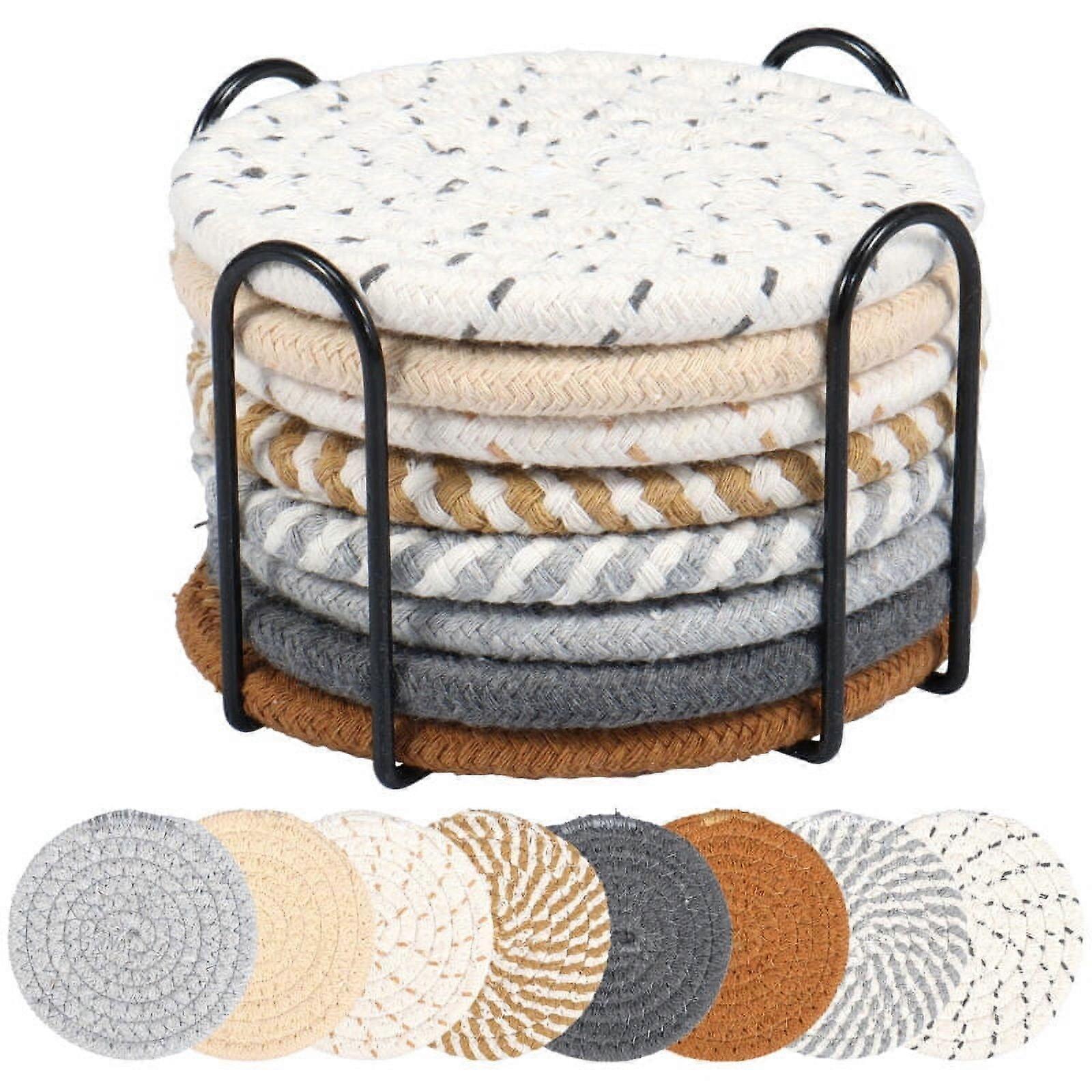 8pcs Absorbent Cup Mat, Heat-Resistant Soft Pad 11cm, Handmade Woven Cotton, Retro Table Mat for Cup Bowl Plate, with Storage Rack, compatible with