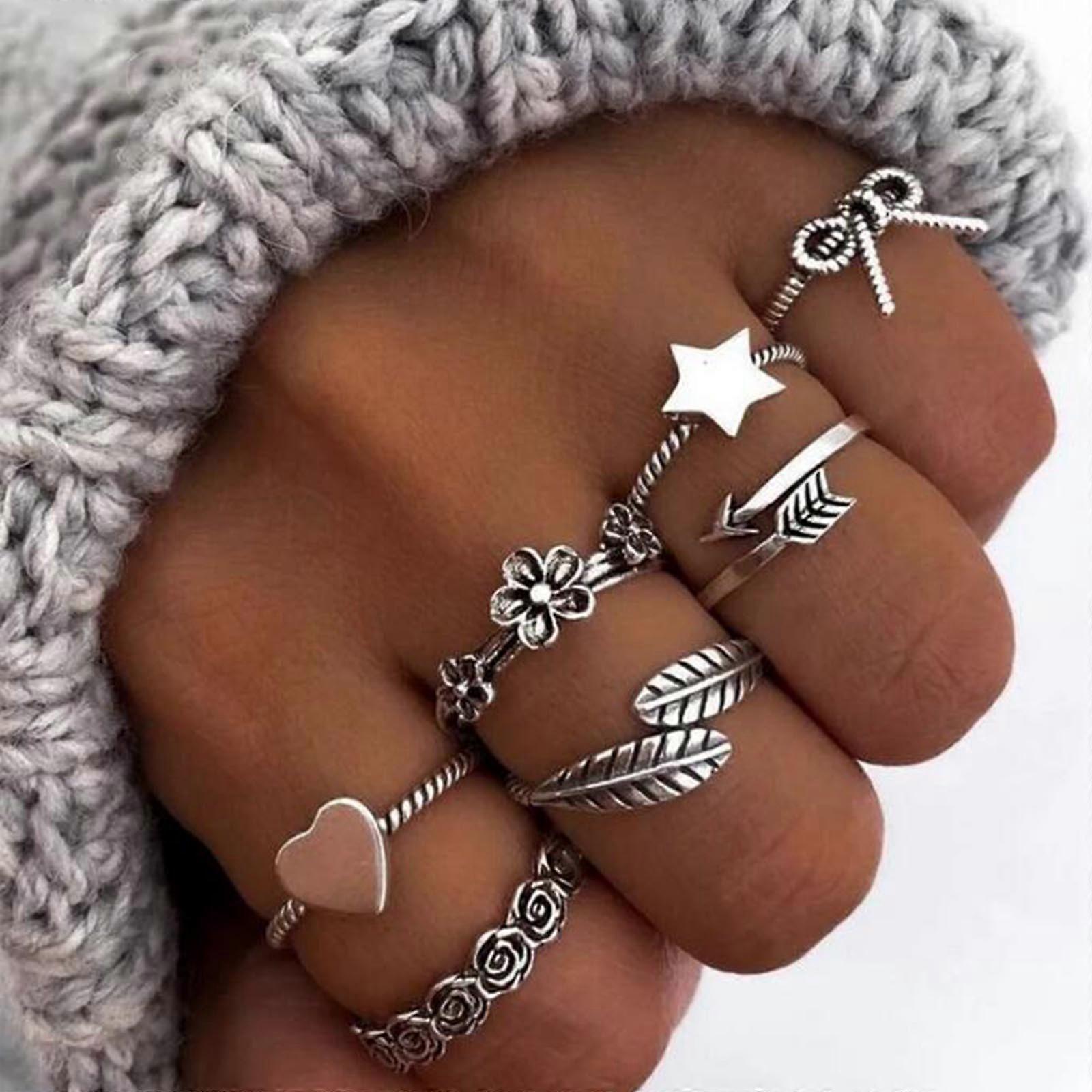 Up to 50% off Women Rings Set of 7Pieces Retro Geometric Hollow Bowknot Heart Five-Pointed Star 7 Sets Of Ring Hand Ornaments for Valentine's Day