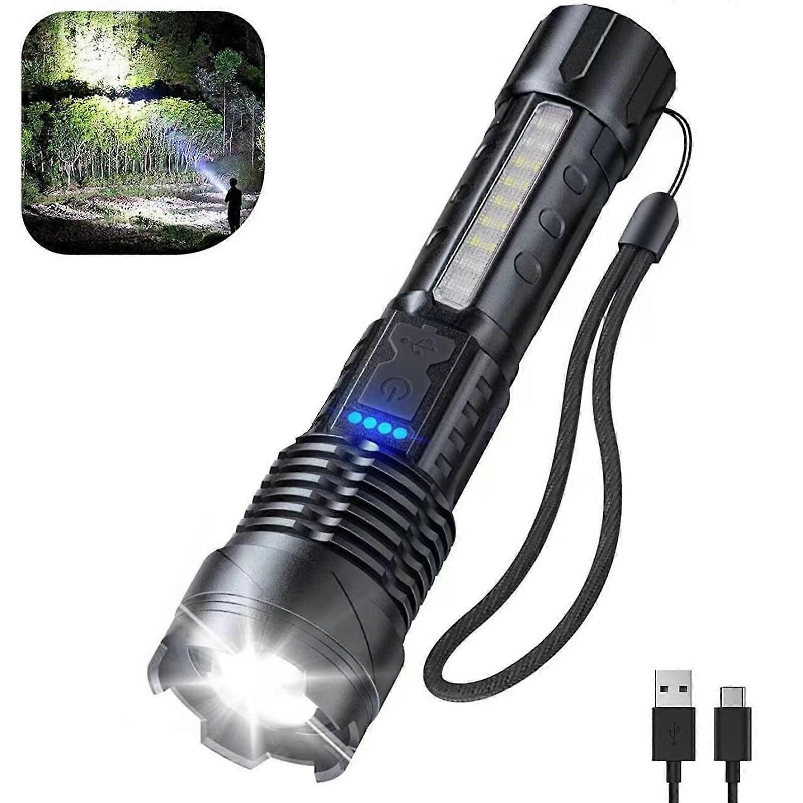 Donemore New Upgraded A70 Tactical LED Flashlight, Ipx5 Waterproof, Shock-Resistant, USB Rechargeable,High Lumens, Adjustable Zoom with 5 Modes, Portable Flashlight Features: 【Economicalk Flashlight】 This Flashlight Rechargeable High Flashlight Utilizes A High-Power Wick To Dispel Darkness, Boasting A Maximum Value Of 20,000 And An Range Of 1000 Meters. It Can Run For 2-8 Hours On A Single Charge. 【Smart Power Indicator Light & Long Battery Life With Fast Charging】A70 Flashlight Equipped With A Built-In Rechargeable Battery And A Convenient Usb-C Charging Port, This Led Flashlight Can Be Fully Charged In About 3 Hours. It Also Features A Smart Power Indicator Light With 25%, 50%, 75%, And 100% Power Level Indications, So You The Battery Status. 【Versatile Lighting Modes】The Economicalk Flashlight Offers Multiple Lighting Options. The Main Light Has Three Modes: Super Bright, Medium Bright, And Flashing. The Side Lights Provide Two Modes: White Light And Blue Flashing. Turning Off The Flashlight Is Easy, As It Can Be Done Directly After 10 Seconds Of In Any Mode Without Cycling Through All Modes.  【Better Quality Life Level Water 】The New Upgraded A70 Led Flashlight Is , Water-, And Strong Shock-. Its Aluminum Alloy Construction Protects The Flashlight From Rust, Scratches, And , Allowing It To Be Used In Various Weather Conditions. However, It Should Not Be Immersed In Water. 【Suitable For Every Occasion】The Flashlight Body Is Made Of Abs Material, While The Head Is Crafted From Aluminum, Ensuring A Yet Portable Design, Weighing Less Than 150 Grams. It Is Widely Used In Automotive Maintenance, Camping, Warehouses, Machine Rooms, Construction, Outdoor Sports, Daily Emergencies, And Other . Product Description: package includes:1pc material:Aluminum alloy [Product Model]: A76 [Bead type]: 30W LED+18LED (10 * LED white light+4 * LED red light+4 * LED blue light) [Product Size]: 16.5 * 4.1 * 2.8CM [Net weight of product]: 132G [ Color box size] : 17.3 * 4.7 * 4.7CM [Gross weight of packaging]: 167G [ Product Material ]: Aluminum alloy+ABS [Battery Capacity]: Built in 1200mAh 18650 battery [ Charging Way ]: Type-C USB Charging [ Position]: Main light 3rd gear: strong light - weak light - fast flashing long press to side lights 10 * LED strong light Side lights 5 : 10 * LED strong light -10 * LED weak light -4 * LED red light -4 * LED red light -4 * LED blue light flashing alternately [Zoom]: Telescopic Zoom WATER PROOF level: IPX4 for domestic waterproofing [Product]: Approximately 800 lumens [Product Range]: Approximately 1000-1500 meters [ Product Features ]: Strong light with side lights, battery level display, tail rope with pen clip for easy carrying, three types of light sources to meet various scenarios [Charging indicator]: Four blue LED battery indicator lights Charging time: about 2 hours Discharge time: approximately 4 hours [Bead type]: 30W LED+18LED (10 * LED white light+4 * LED red light+4 * LED blue light) [Product Size]: 16.5 * 4.1 * 2.8CM [Net weight of product]: 132G Donemore New Upgraded A70 Tactical LED Flashlight, Ipx5 Waterproof, Shock-Resistant, USB Rechargeable,High Lumens, Adjustable Zoom with 5 Modes, Portable Flashlight Features: