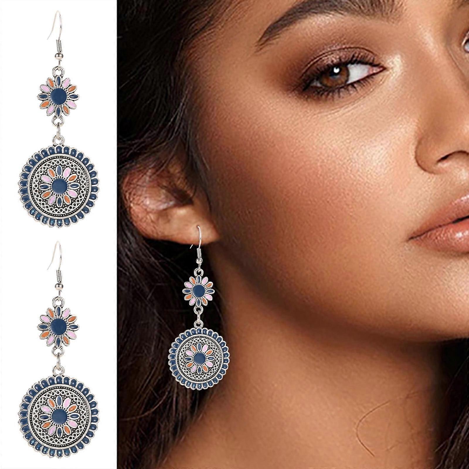 Valentines Day Gifts Savings Deals! WJSXC Flower Round Wheel Fashion Creative Bohemian Vintage Carved Water Drop Tassel Earrings Multicolor