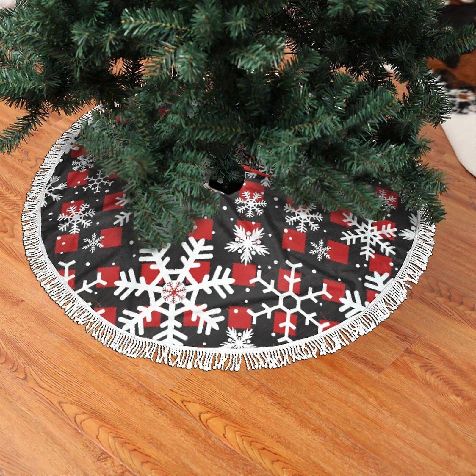 Christmas Fringed Lace Tree Skirt, Christmas Snowflakes With Red And Black Buffalo Tartan Pattern Soft, Light, Good Touch Tree Skirt 36"