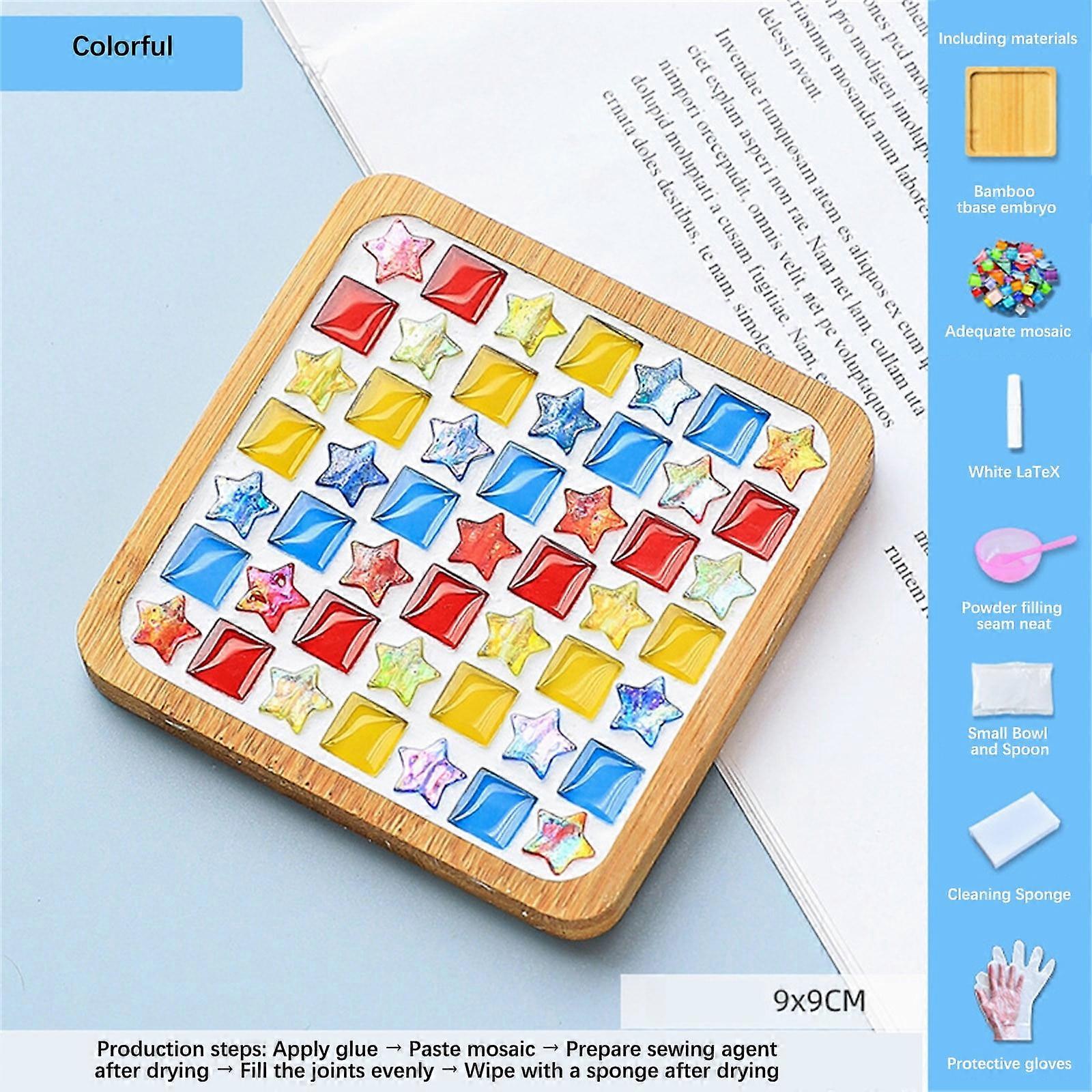 JingChun 1 Set DIY Glass Mosaic Tiles for Crafts, Mixed Colors with Wooden Coaster – Mosaic Kit for Adults, Handmade Home Decor Gift