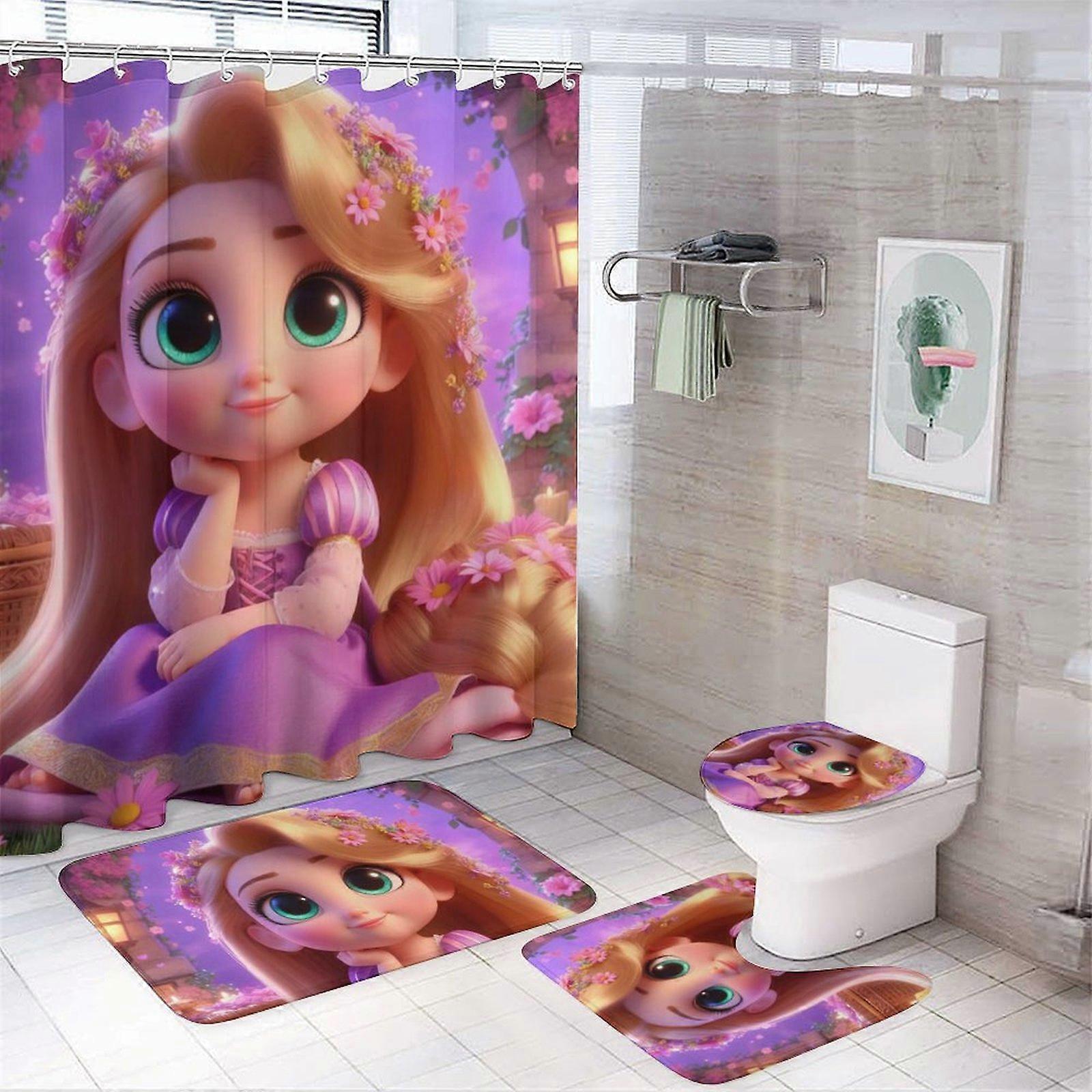 Rapunzel 4 Pcs Shower Curtain Set with Non-Slip Rugs, Toilet Cover & Bath Mat, Compatible with Kids Bathroom Decor, 72"x72"