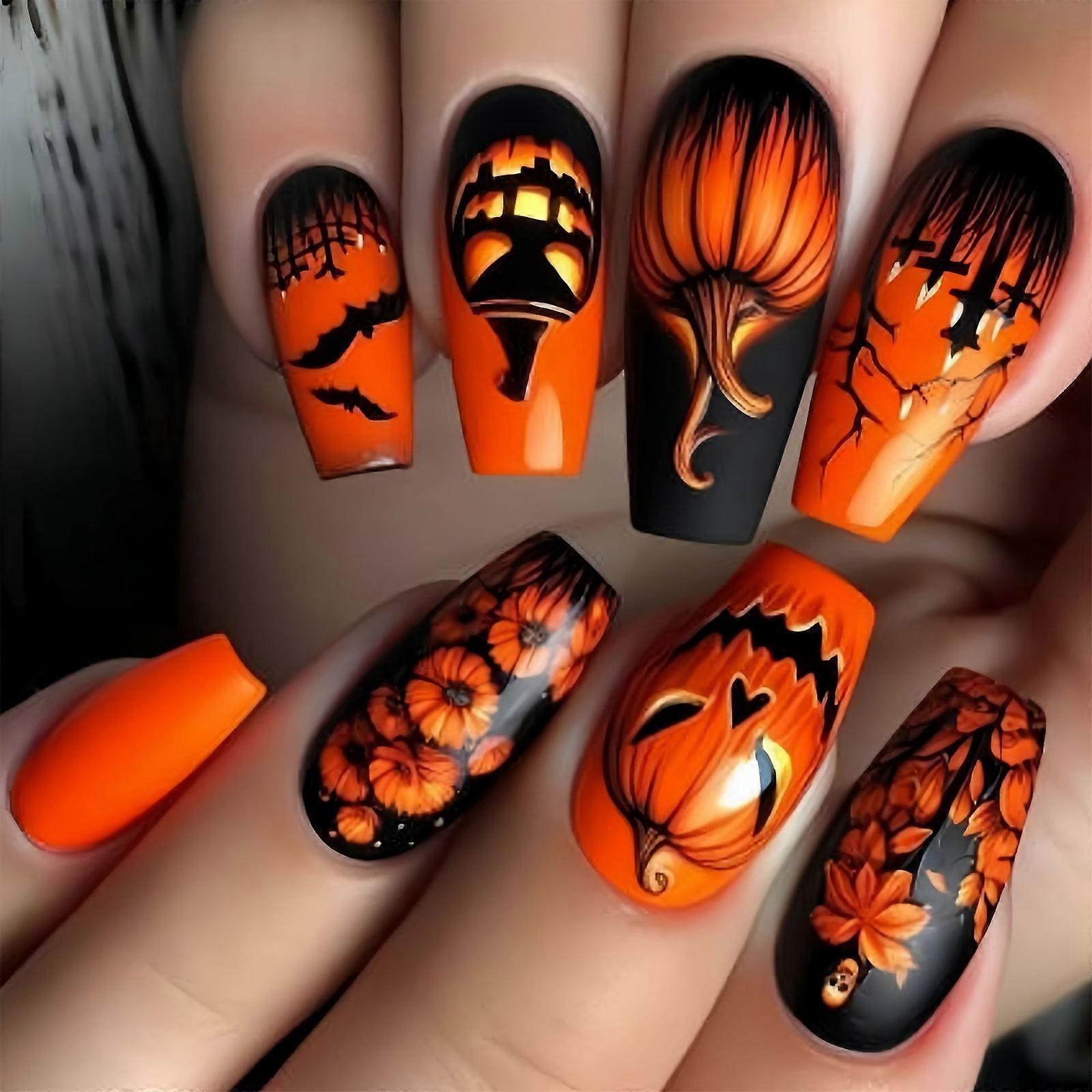 Pumpkin Ghostly Spiders Web Square False Nail Medium Length ABS Finish Lightweight Comfortable Halloween Nail Art Multicolor