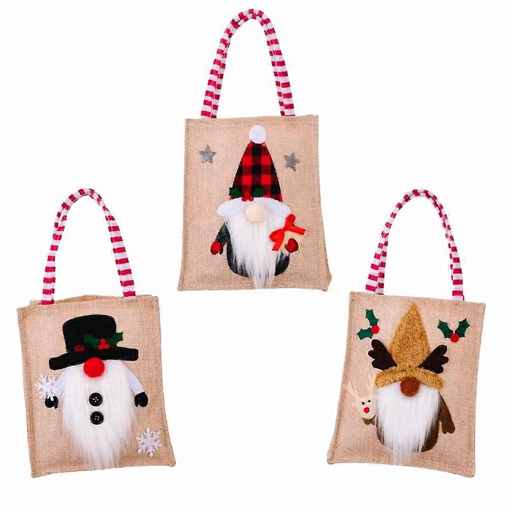 3 Pcs Large Christmas Linen Gift Bags with Handle, Reusable Tote for Grocery Shopping, Santa Snowman Reindeer Design, Holiday Xmas Party