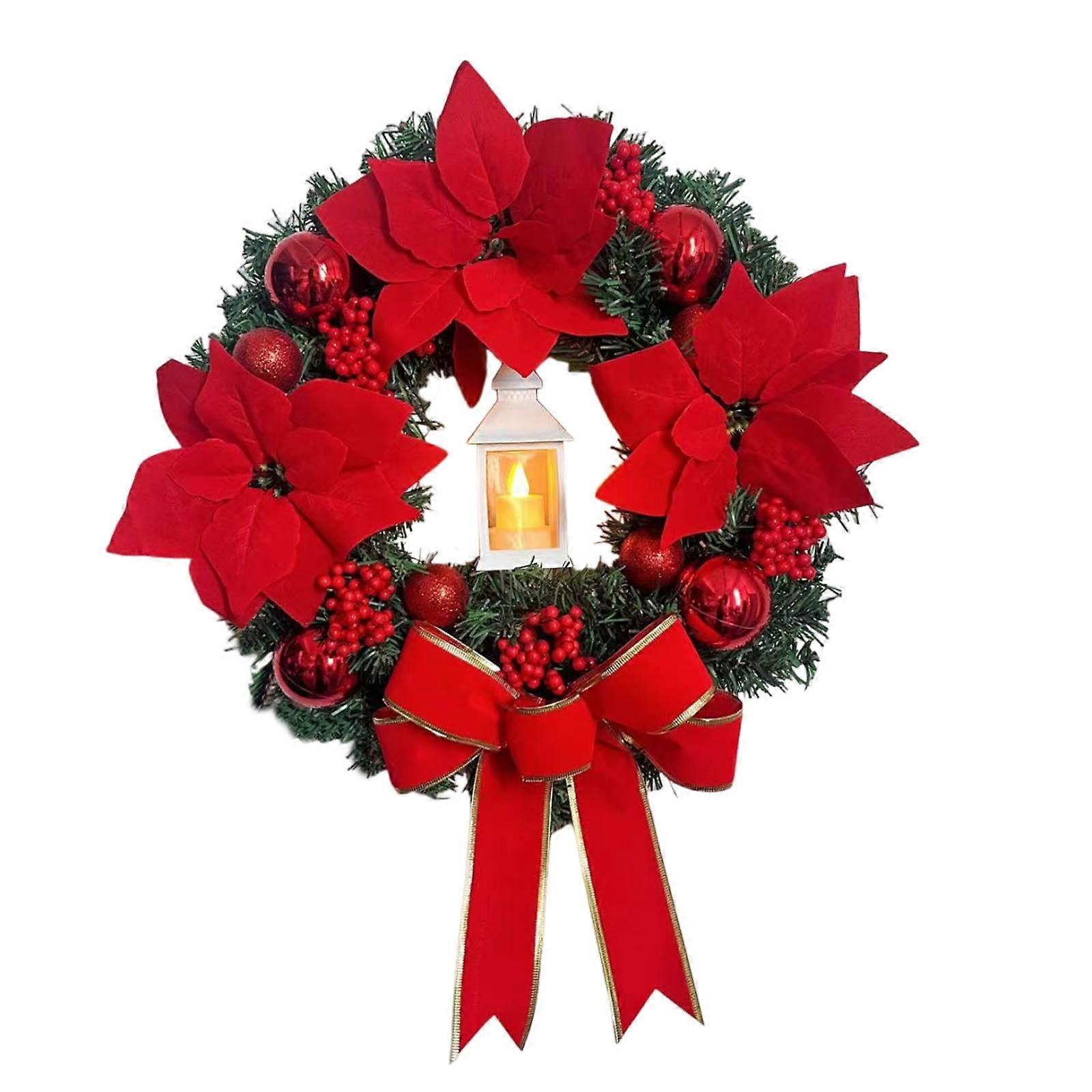 Christmas Wreath for Front Door, Red Berries Poinsettia Flowers Bow Ball, Indoor Outdoor Wall Decor (Small)