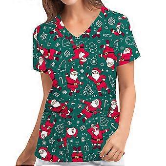 Christmas Lady Nursing Uniform Scrub Short Sleeve V-Neck T-Shirt Xmas Tee Top UK