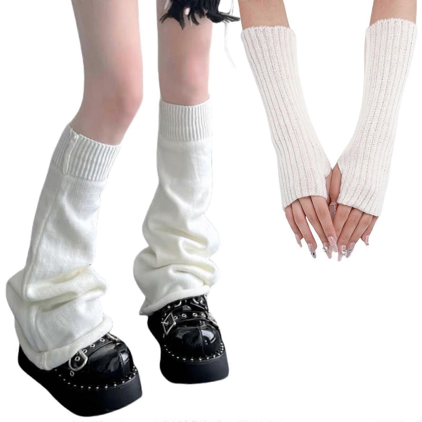 Womens Leg Socks Arm Sleeve Stripe Knit Arm Warmer Gloves Leg Warmer Socks 80s Outfit for Women Party White