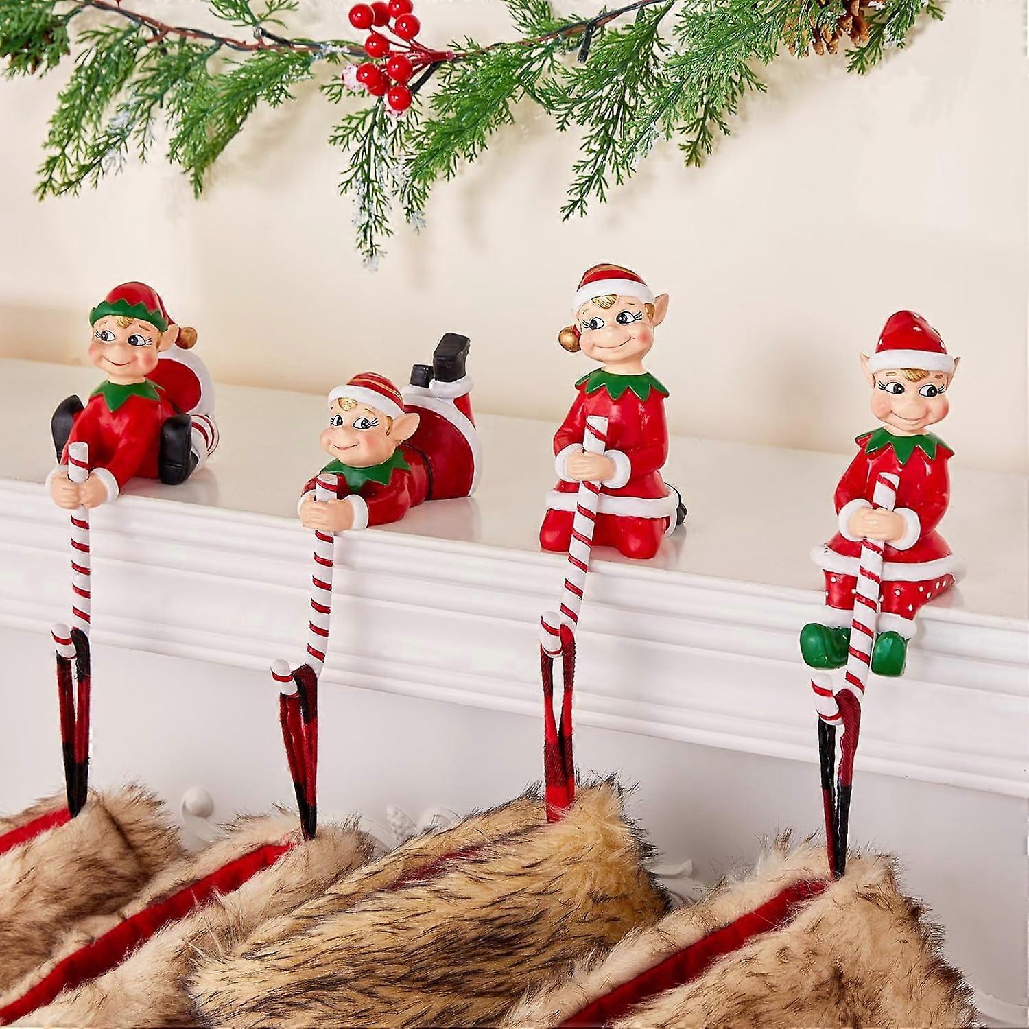 Christmas 3D Elves Stocking Holders Set of 4, Hand-Painted, Weighted Non-Slip Hooks for Mantel, compatible with Fireplace Decor
