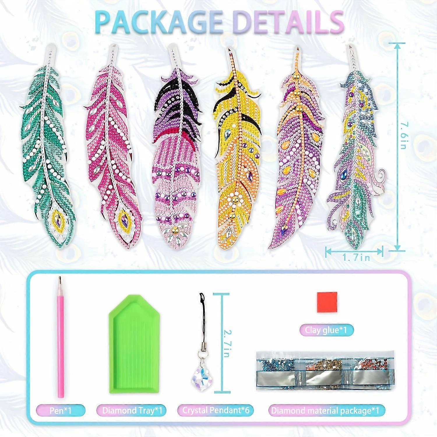 6pcs/set DIY Diamond Art Durable PET Single Sided Stick Crystal Rhinestone Book Note 5D Diamond Painting Feather Bookmark Kit