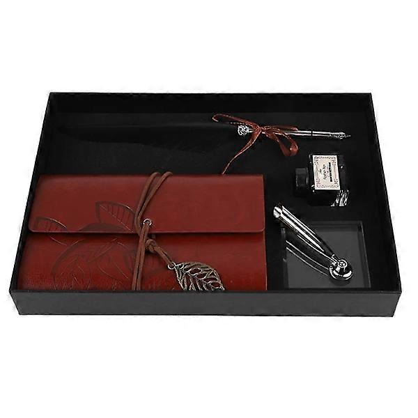 Retro Leather Notebook Fountain Pen Feather Dip Pen Ink Bottle Set Stationery Gift Box Black YC