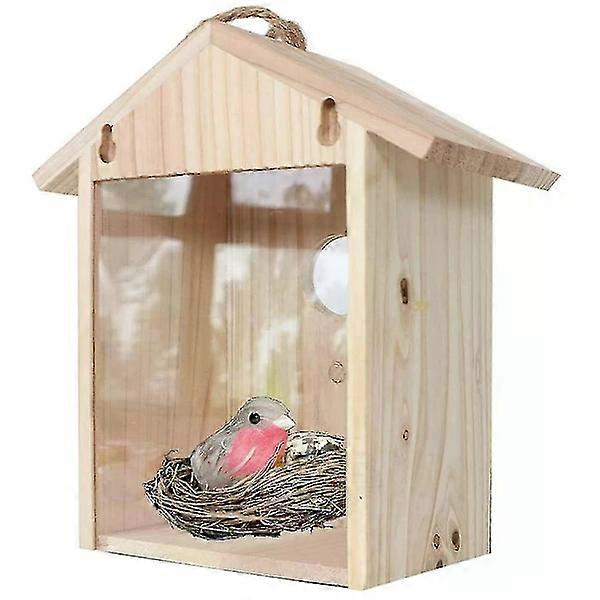 Bird feeder with spy window and one-way mirror foil, wooden birdhouse YC