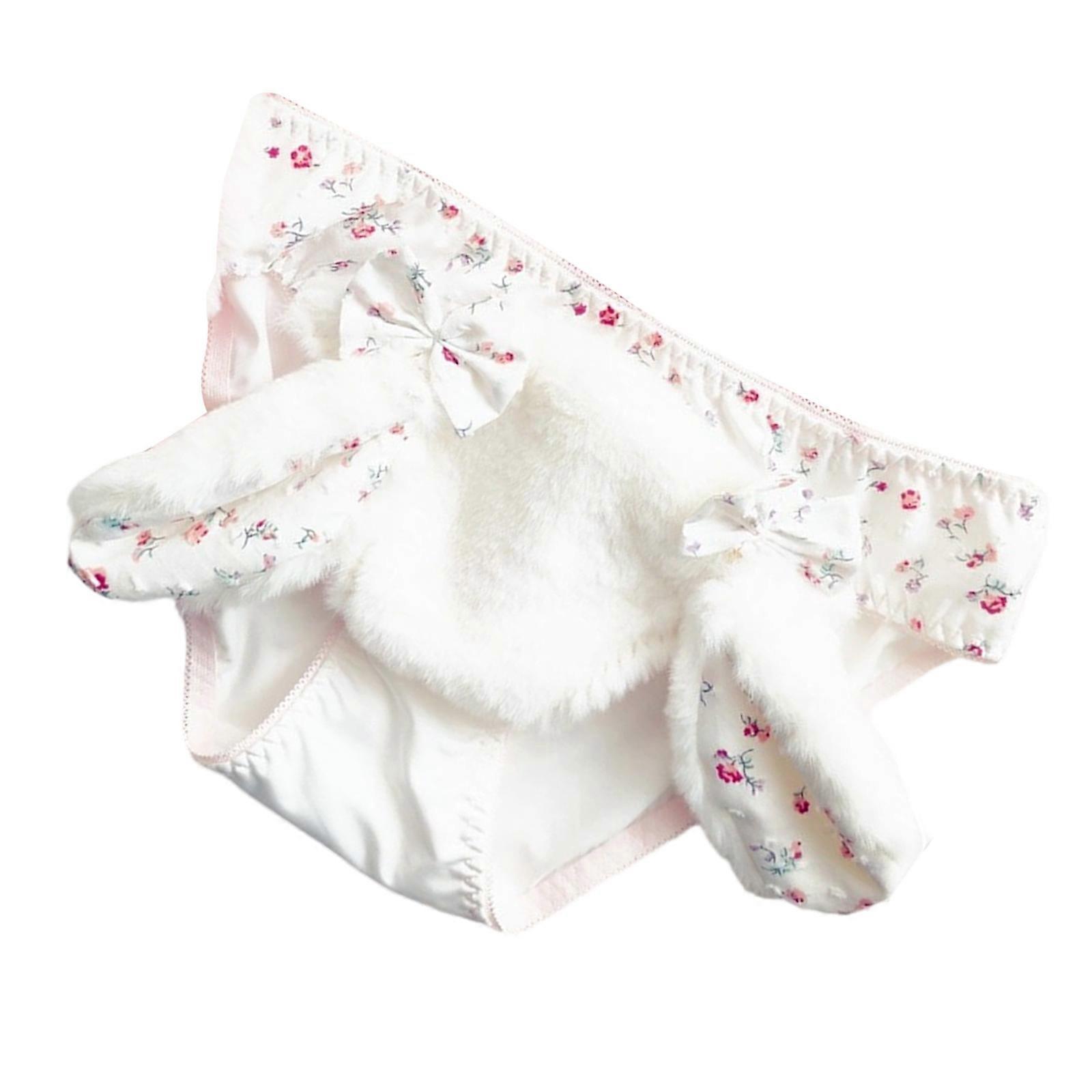 Rabbit Ears Floral Print Panties Japanese Sweet Furry Women's Panties Underwear Bowknot Accent Briefs Lingerie Underpants White XL