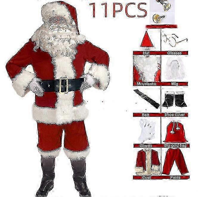 Men's Santa Claus Costume Adult Christmas Santa Claus Costume Santa Suit Five piece set includes: hat+beard+coat+trousers+belt. Seven piece set includes: hat+beard+coat+trousers+belt+gloves+leather boot cover. Nine piece set includes: hat+beard+coat+trousers+belt+gloves+leather boot cover+bell+glasses. Eleven piece set includes hat+beard+coat+trousers+belt+gloves+leather boot cover+bell+glasses+wig. Hand Wash Only. Imported Santa Claus Costume: santa costume is made with premium polyester velvet flannel. This santa suit is very suitable for ordinary figure to wear. The red costumes includes 10 pieces: Coat, Pants, Belt, White Beard, Wig, a Hat, Gloves, Golden Bag, Boot top, Party Blowers. High Quality Material: Great for a costume or wear for the Christmas holidays You will stand out in the parties once you wear them. Premium Christmas Santa Calus Costume is made of high quality material. It is breathable, warm and comfortable, skin-friendly, and healthy for your body. Elegant Detail: Super light santa beard with elastic band, great breath, and it will give you a better convenient and comfortable wear experience. new fantastic quality Standard Christmas Santa costume. MERRY CHRISTMAS: Friends, family, and the kid inside, everyone will enjoy a visit from Santa; Fun for holiday parties. This adult santa claus costume suit is an investment to bring smiles to the faces of all the kids around you.