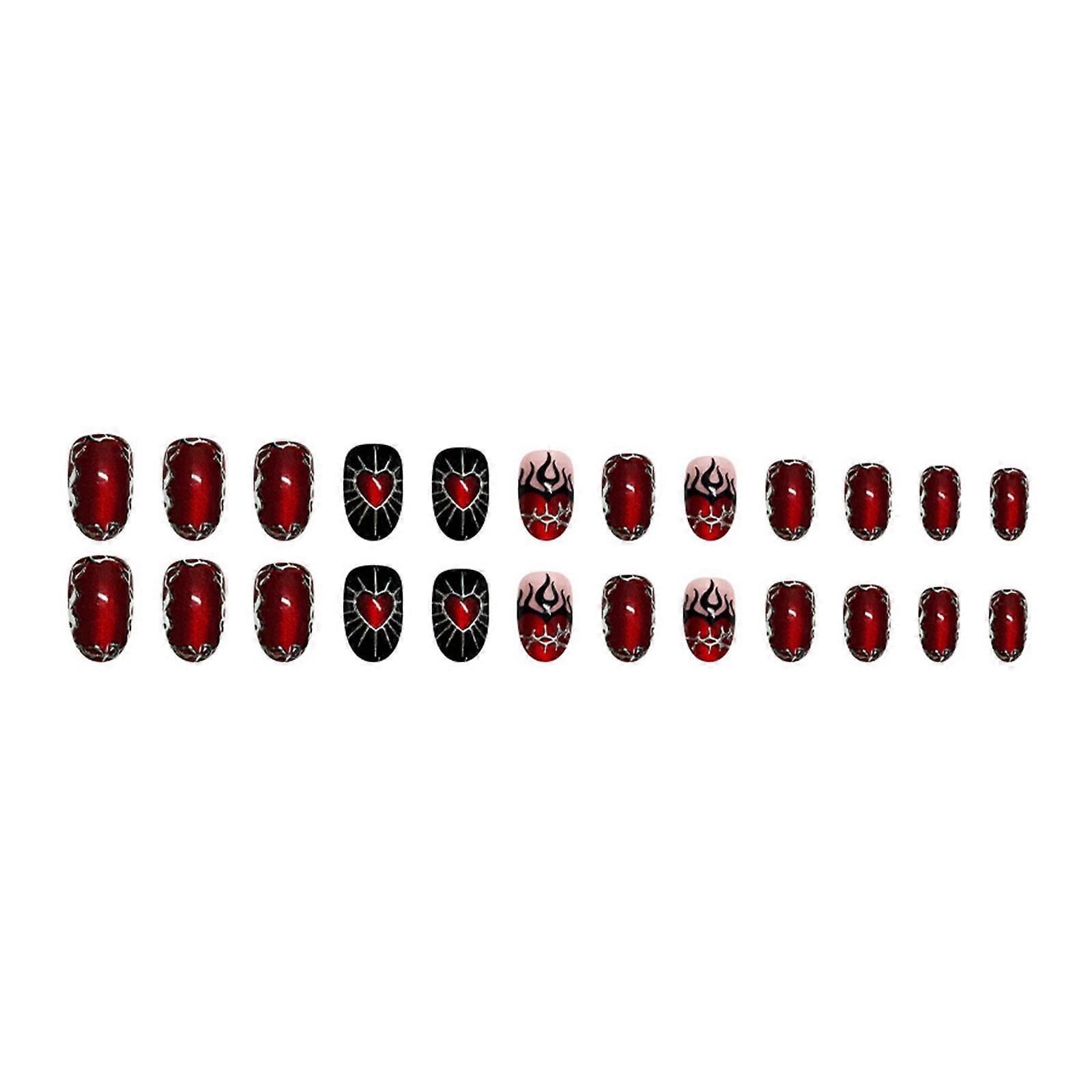 Professional 3D Cats Eye Flame Press On Nail 24Pieces Red Heart Valentines Design Gold Foils Detailing Multiple Size Kit Multicolor