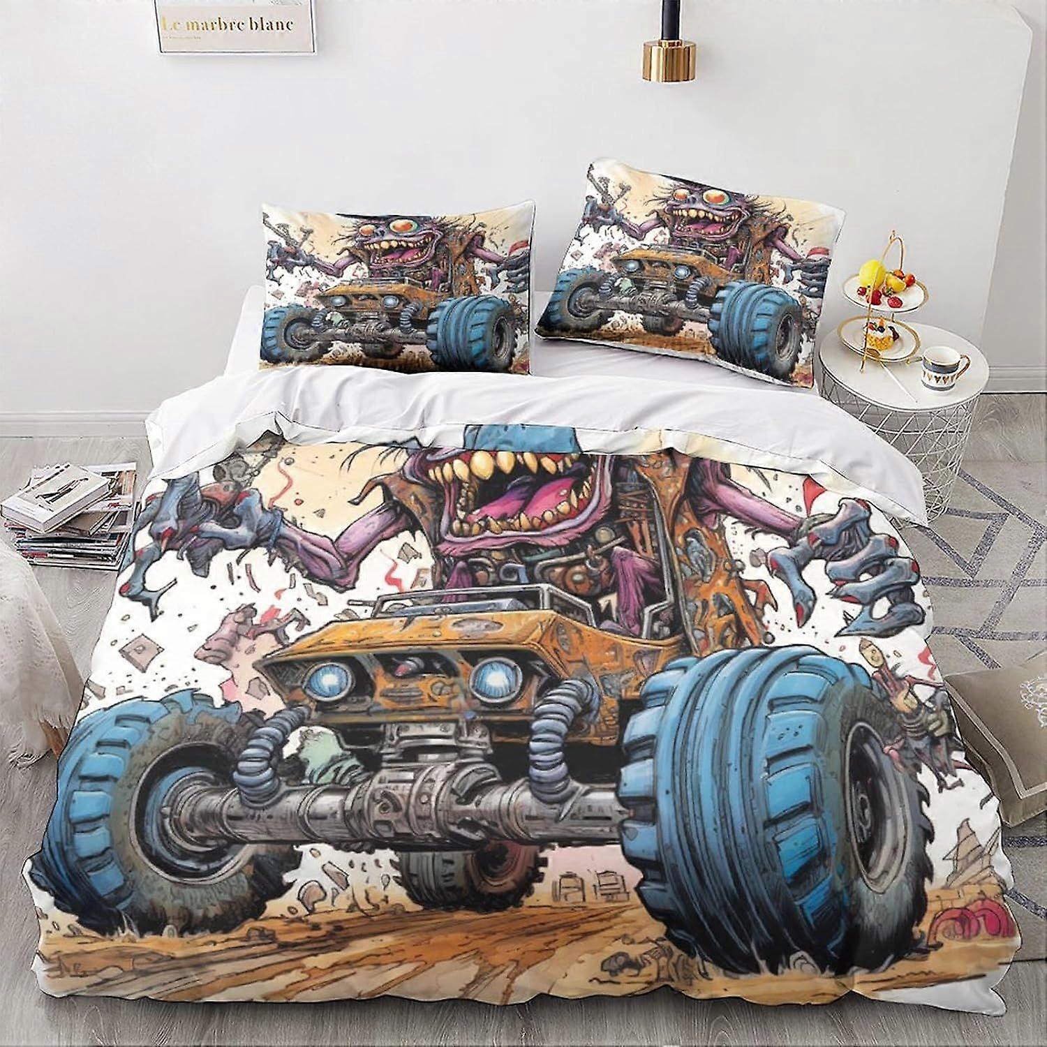 LikeEj Monster Style 3D Digital Print Vintage Car Bedding Sets Cartoon Print Duvet Cover Sets Soft Microfiber 3Pcs Quilt Cover with Zipper Closure