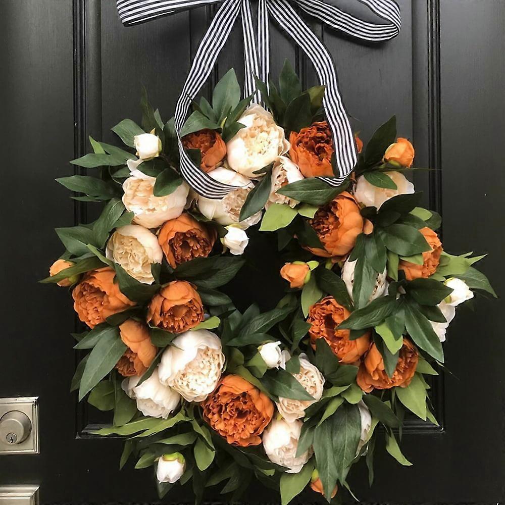 15.7 Inch Spring Artificial Peony Flower Wreath for Front Door for Wedding ,Pink Rose Floral Door Wreath with Leaves and Bow for Home Decorations