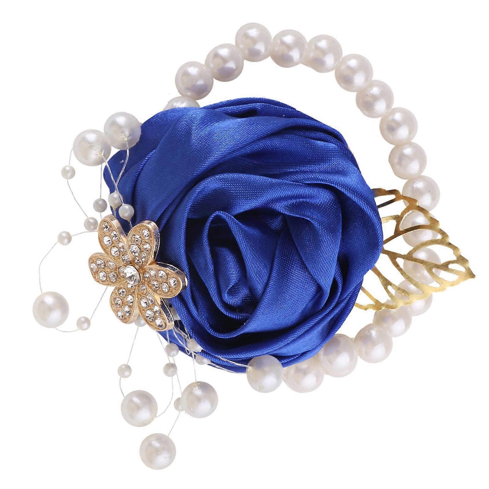 Romance Pearls Decors Wrist Corsage Satined Wrist Flower with Elastic Wristband For Bride Wedding Celebration Receptions Royal Blue