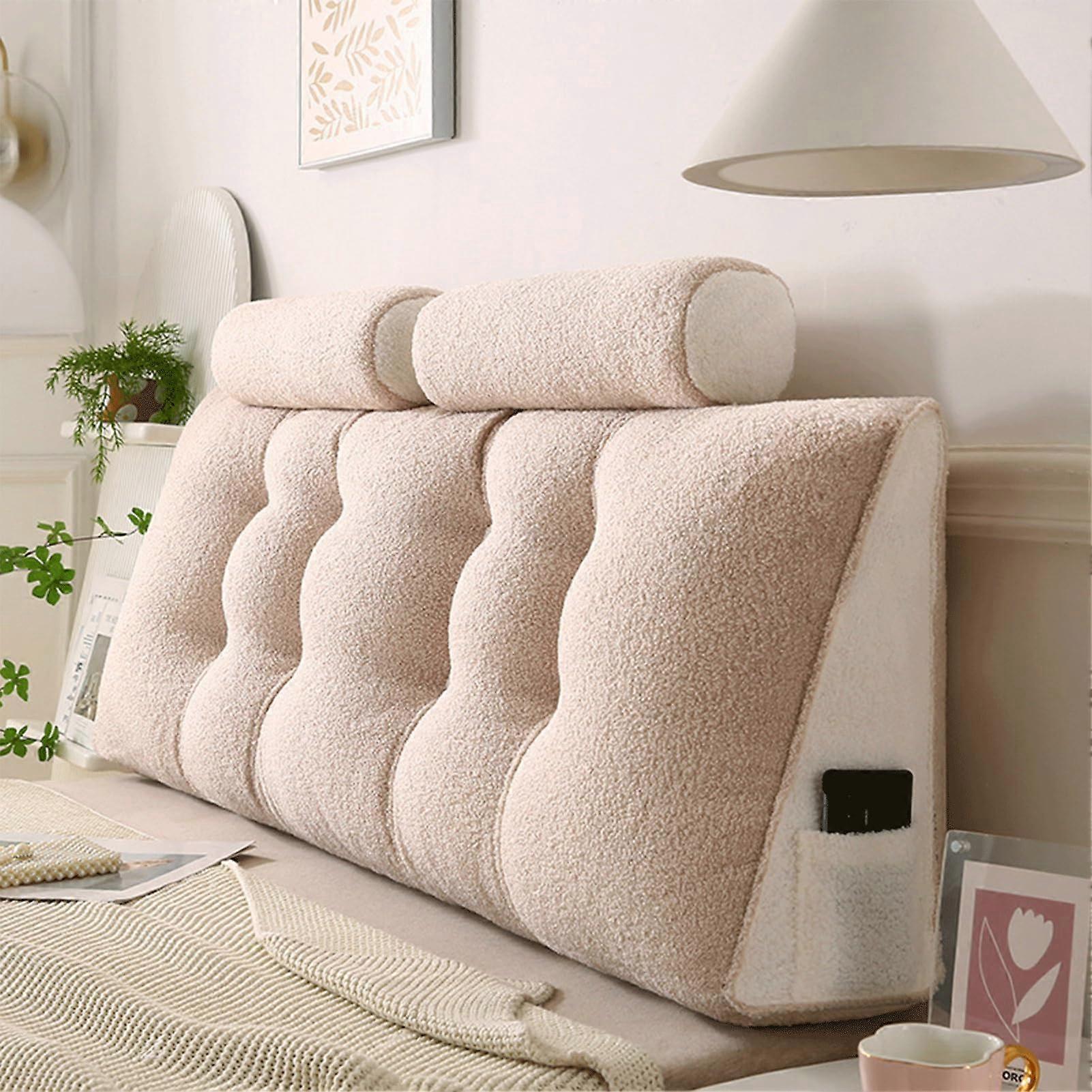 Headboard Pillow Twin XL Teddy Velvet Wedge with 2 Neck Roll Cushions, Removable Cover for Dorm Sitting and Sleeping, Beige 120×50×20cm