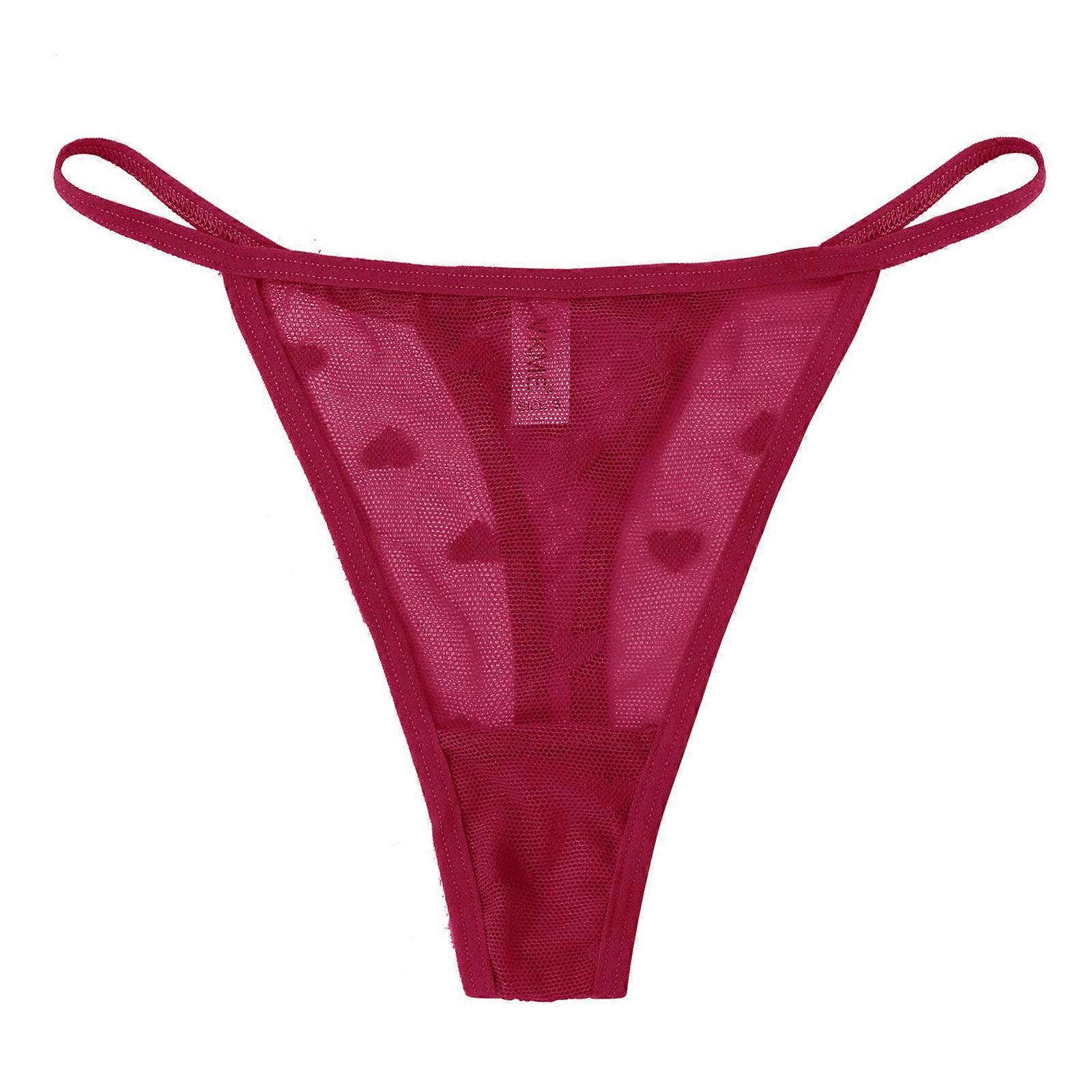 Heart Print Sheer Mesh Briefs Low Waist Thong for Women T-Back G-String Panties Intimate Lingerie Breathable Underwear Burgundy S