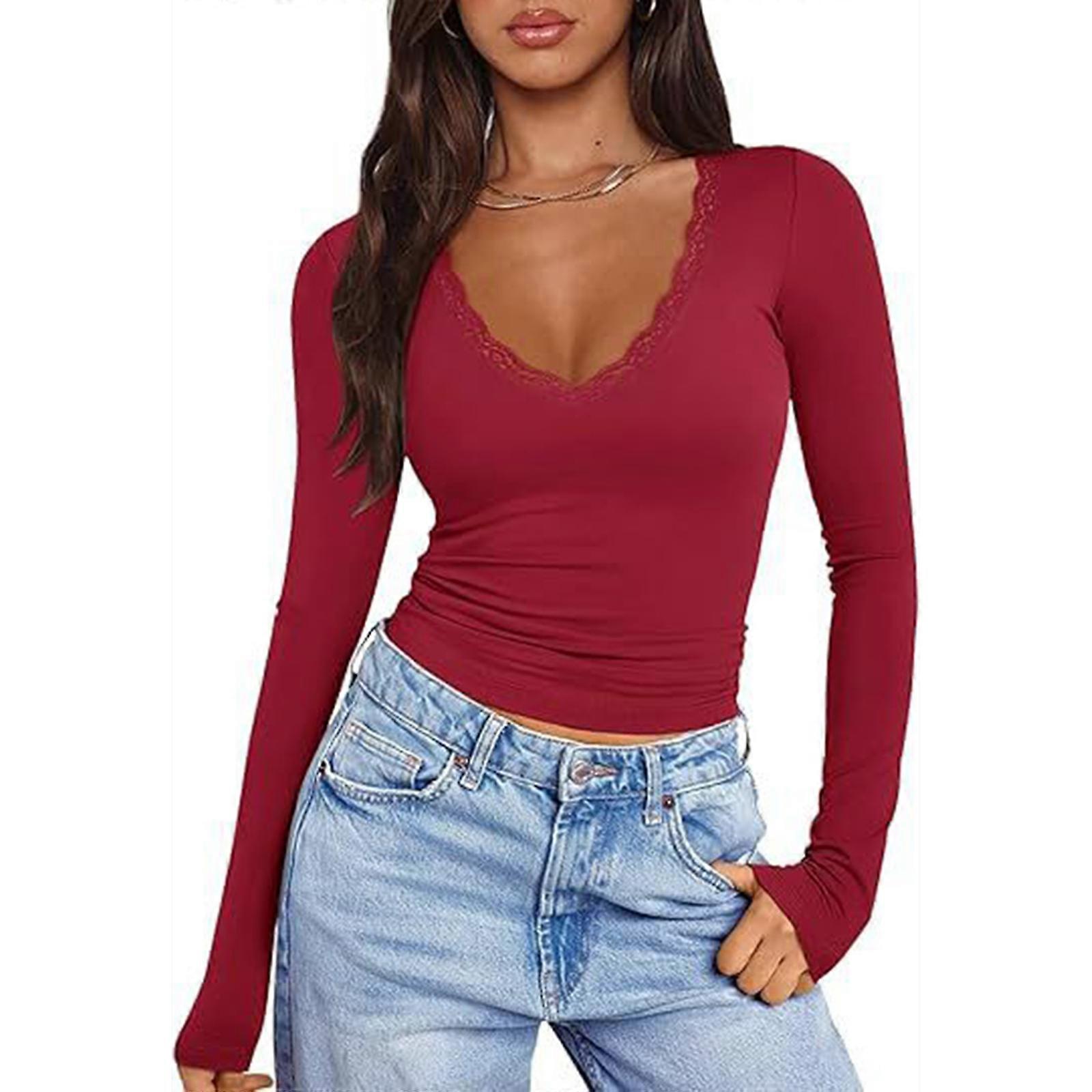 Feminine Lace V Collar Long Sleeve Shirt Stretchy Thermally Solid Color Fall Winter Base Layers Long Sleeve Tops Burgundy XL