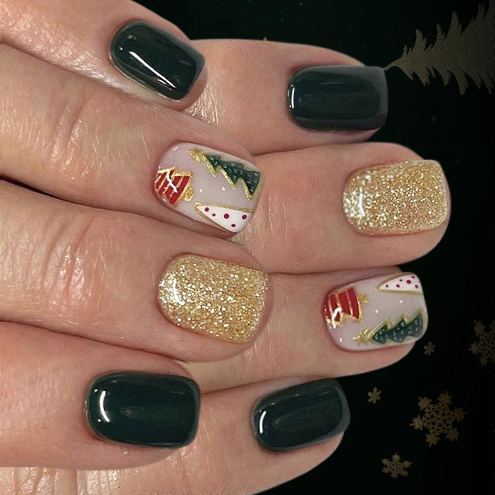 Christmas Tree Glitters Press On Nail 24Pcs Dark Green Gold Shimmers Nail Tips ABS Build Long Lasting Party Wear Multicolor