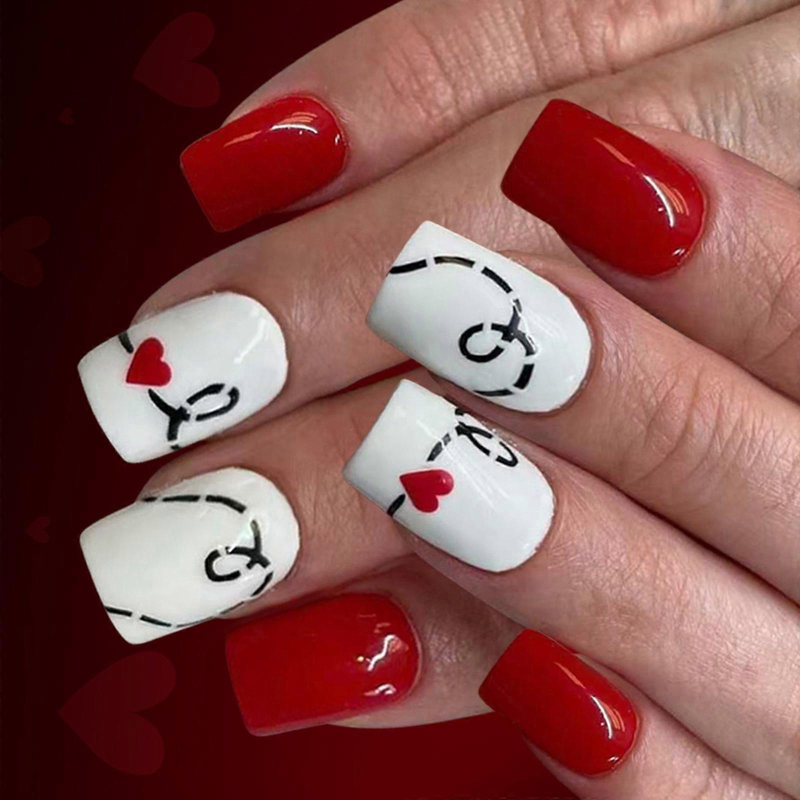 Shining Red Heart Pattern Short False Nail 24Pack ABS Nail Art Set for Valentines Dates and Multicolor