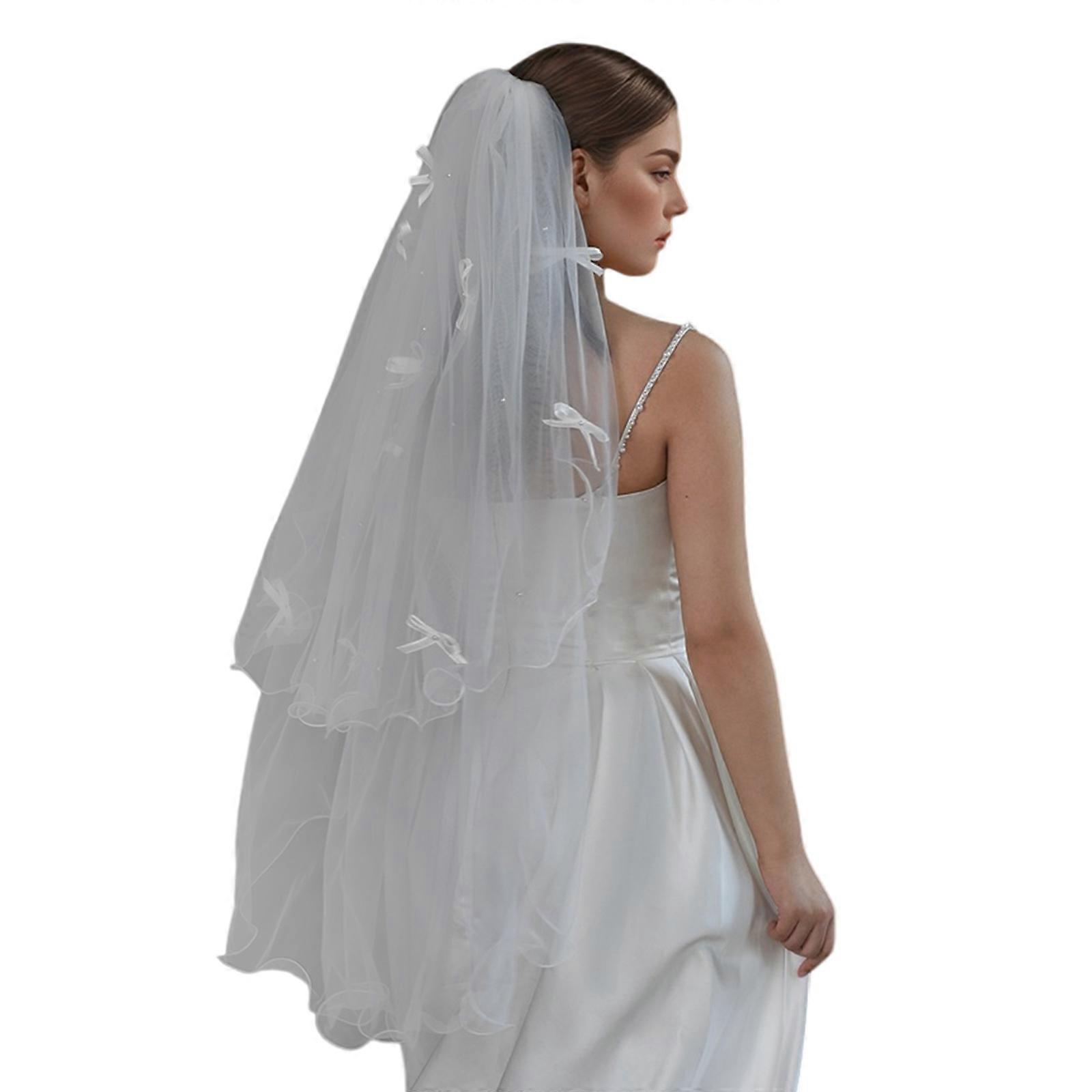 Bowknot Pearls Studded Bridal Veils Airy Sheer Hair Accessory For Wedding Ribbon Adorned Headpiece Classical Design Cream