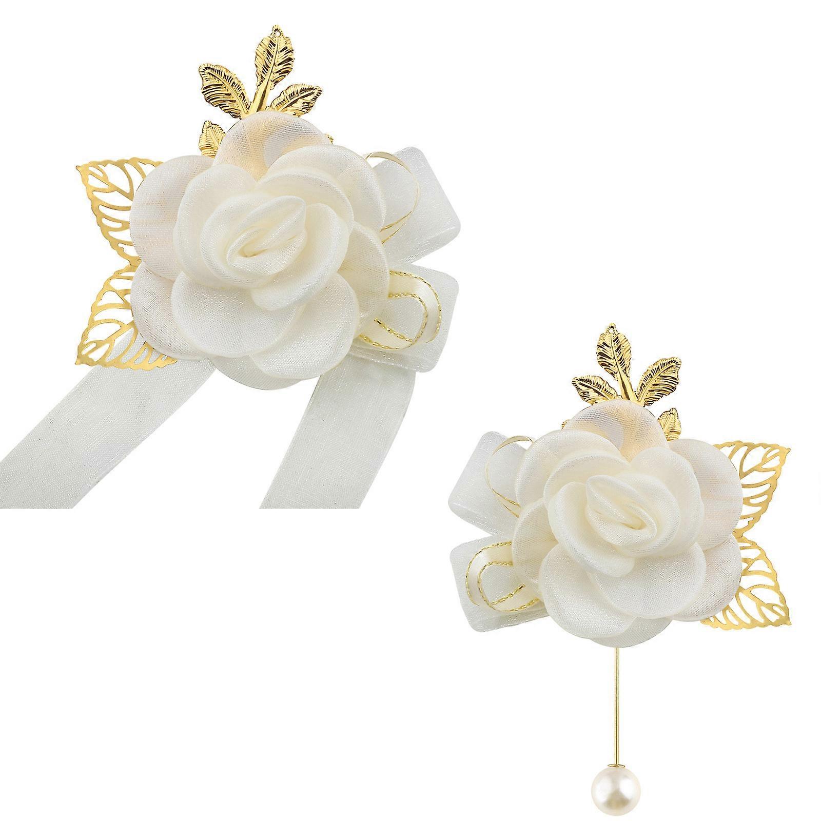 Realistic Fabric Boutonniere and Wrist Corsage Set For Wedding Ceremony Bride Groom Flower Pin for Formal Occasion Cream color