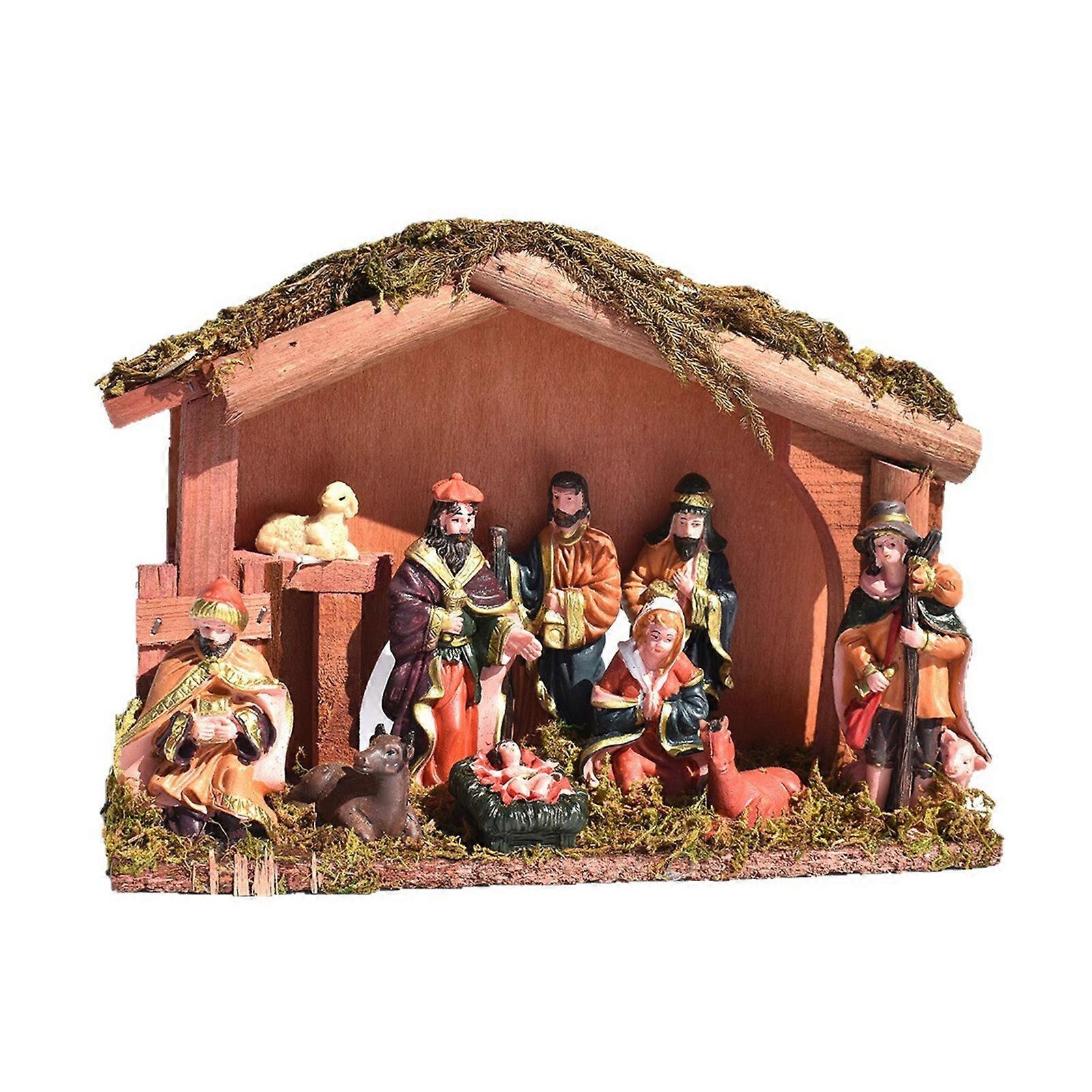 Religious Christmas Birth Display Hand Daubed Rosin Figures And Oaken Stable Multicolor