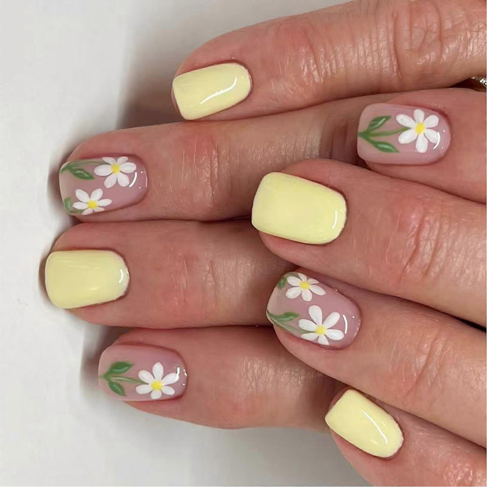 24 Pcs Short Square Stick on Nail Glossy Full Cover False Nail Yellow Press On Nail Manicures Supplies for Woman Multicolor