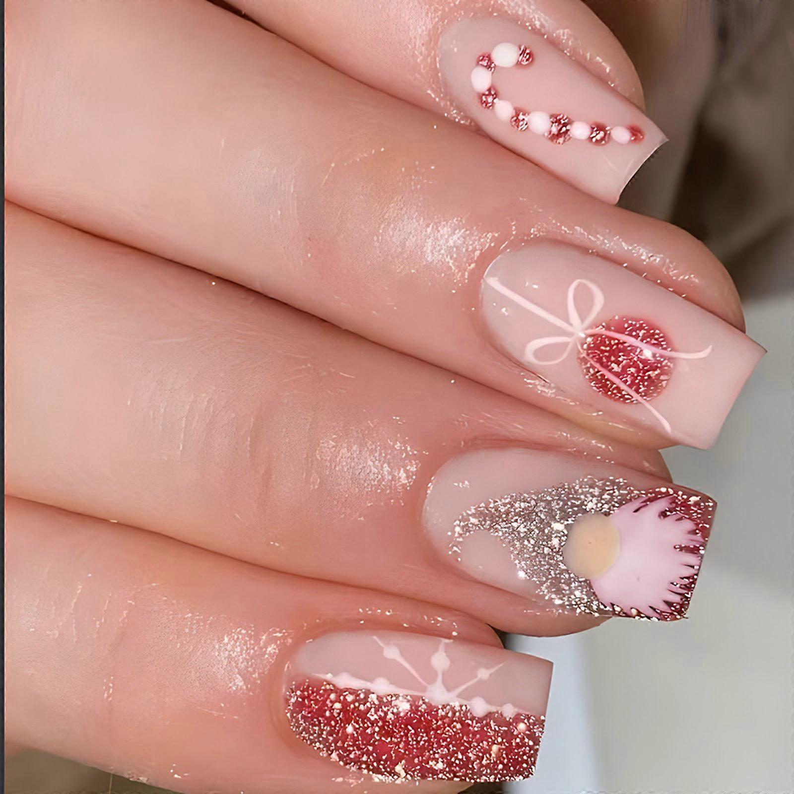 24Pcs Short Square Christmas False Nails Elegant Fall Press on Nails Fall Glitters French Tip Stick on Nails Snowflakes Multicolor
