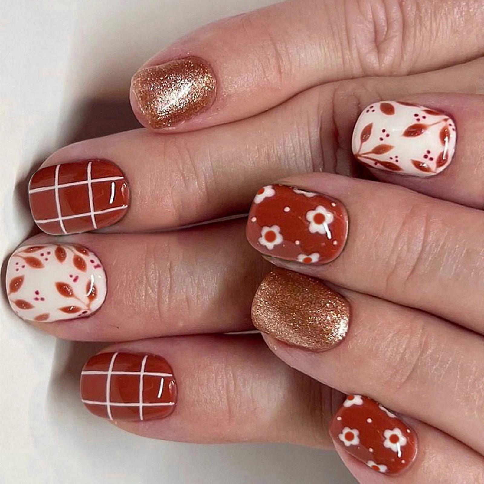 24 Pcs Glittering False Nails Flowers and Lines Artificial Nails Full Cover Stick on Nails Short Square Press On Nails Multicolor