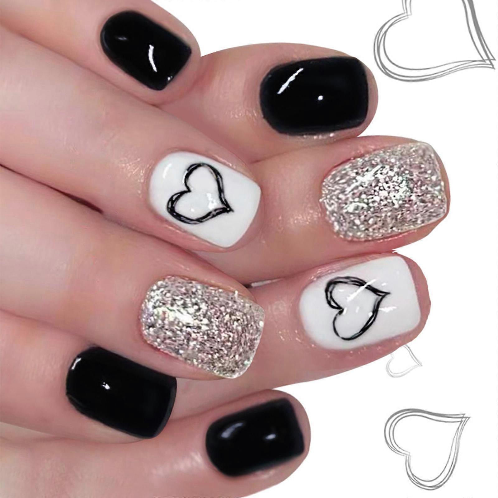 24Pieces False Nail Easy Apply Multiple Size Black Heart Design Short Square Silver Glitters Fake Nail Party Accessories Multicolor