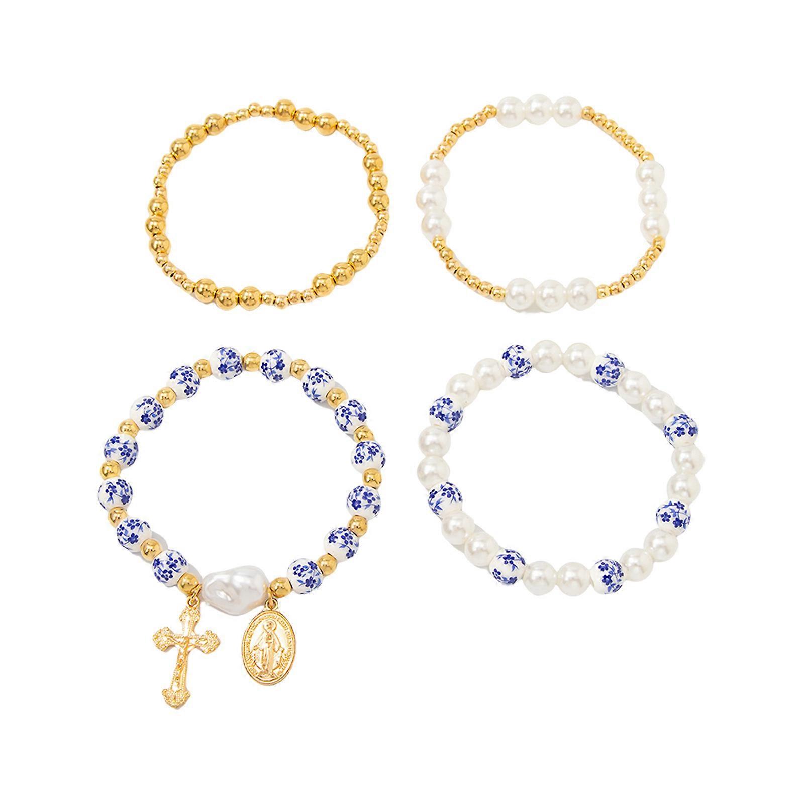 Chinese Inspired Ceramic Bead Bracelet Featuring Crosses Charm and Imitation Pearls Accents Minimalist Wrist Accessory Multicolor