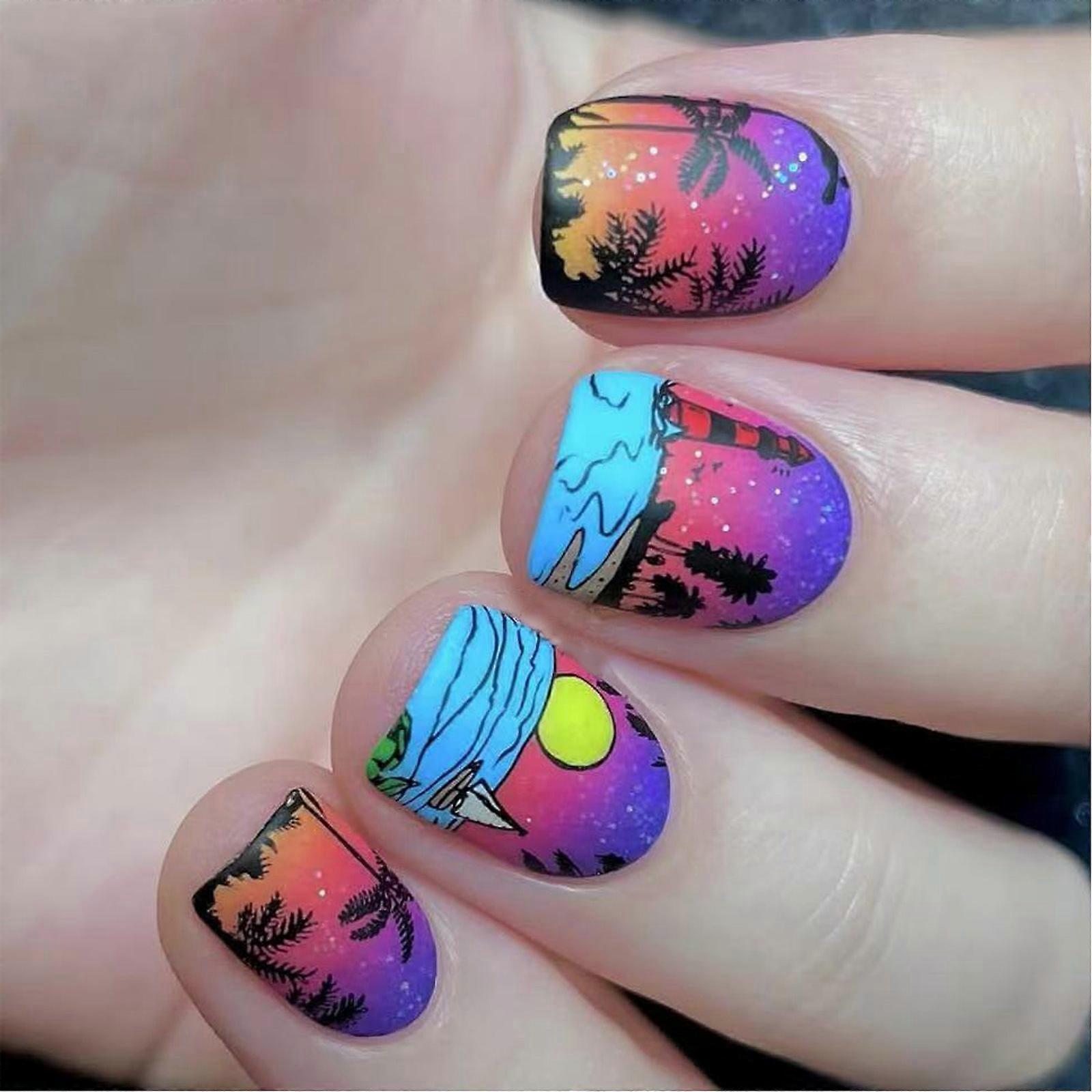 24x Short Square Press On Nail Sunset Acrylic False Nail Glossy Artificial Nail Coconut Tree Stick on Nail for Party Multicolor