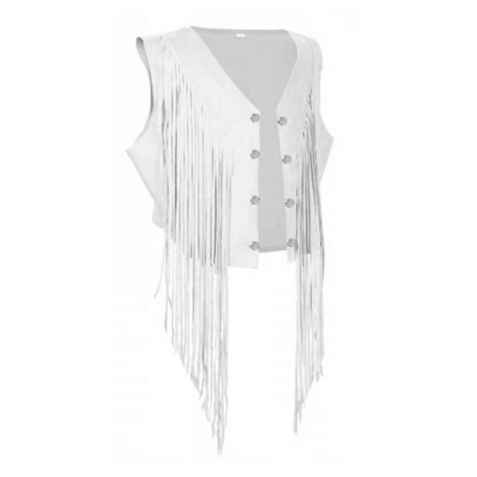 Women's Fringe Vest Sleeveless Tassels Cropped Cardigan Cowgirl Western Top for 70s Hippie Clothes Music Festival Party White S