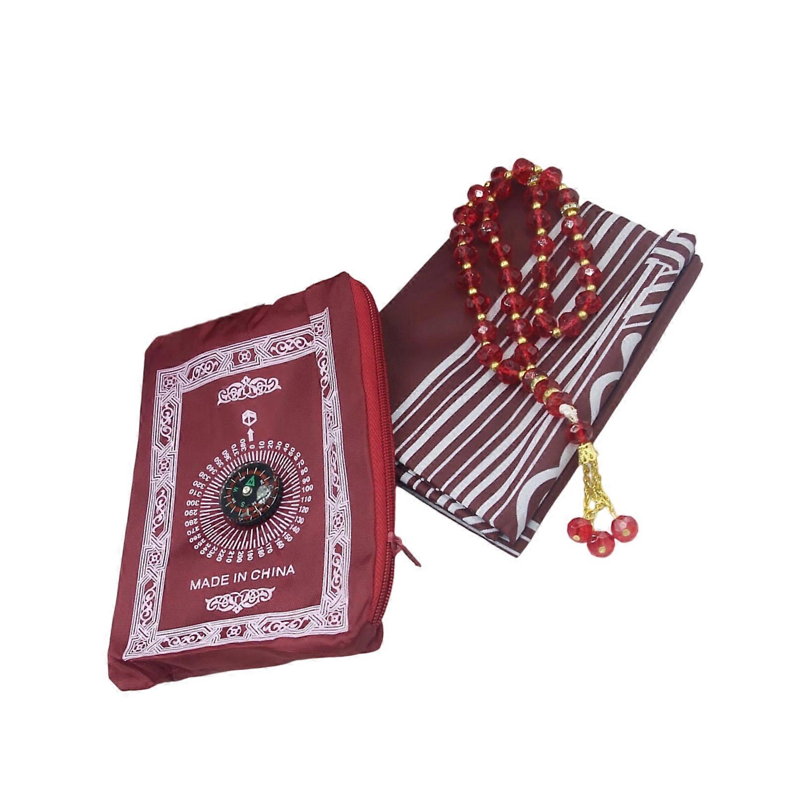 Travel Prayer Rug With Builts In Qibla Compasses and Beads Portable Islamic Mat For Outdoor Worship And Home Use Red
