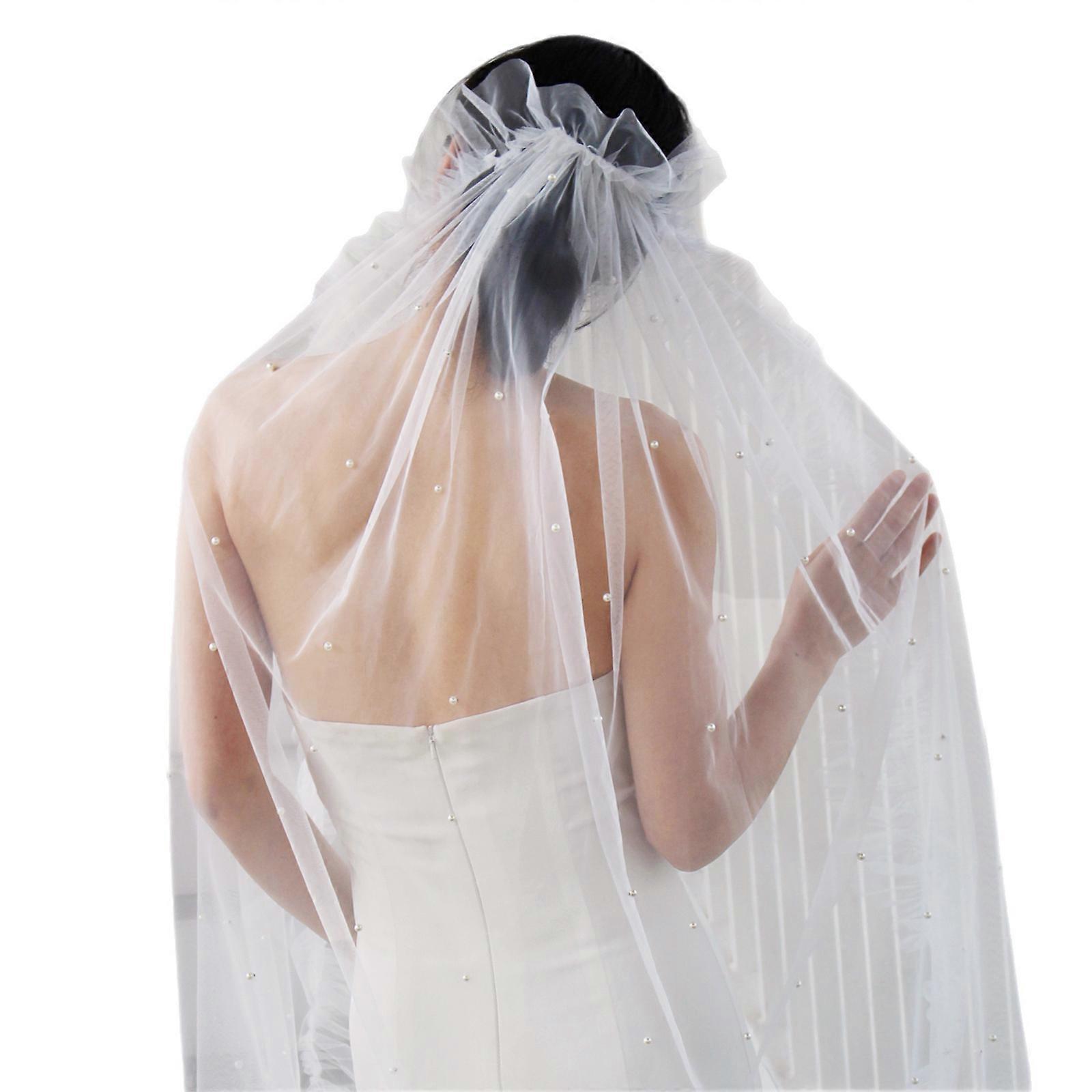 Single Layer Pearls Decors Bridal Veils with Hair Comb Romance Ruffle Trim Wedding Veils Head Accessory for Special Event White