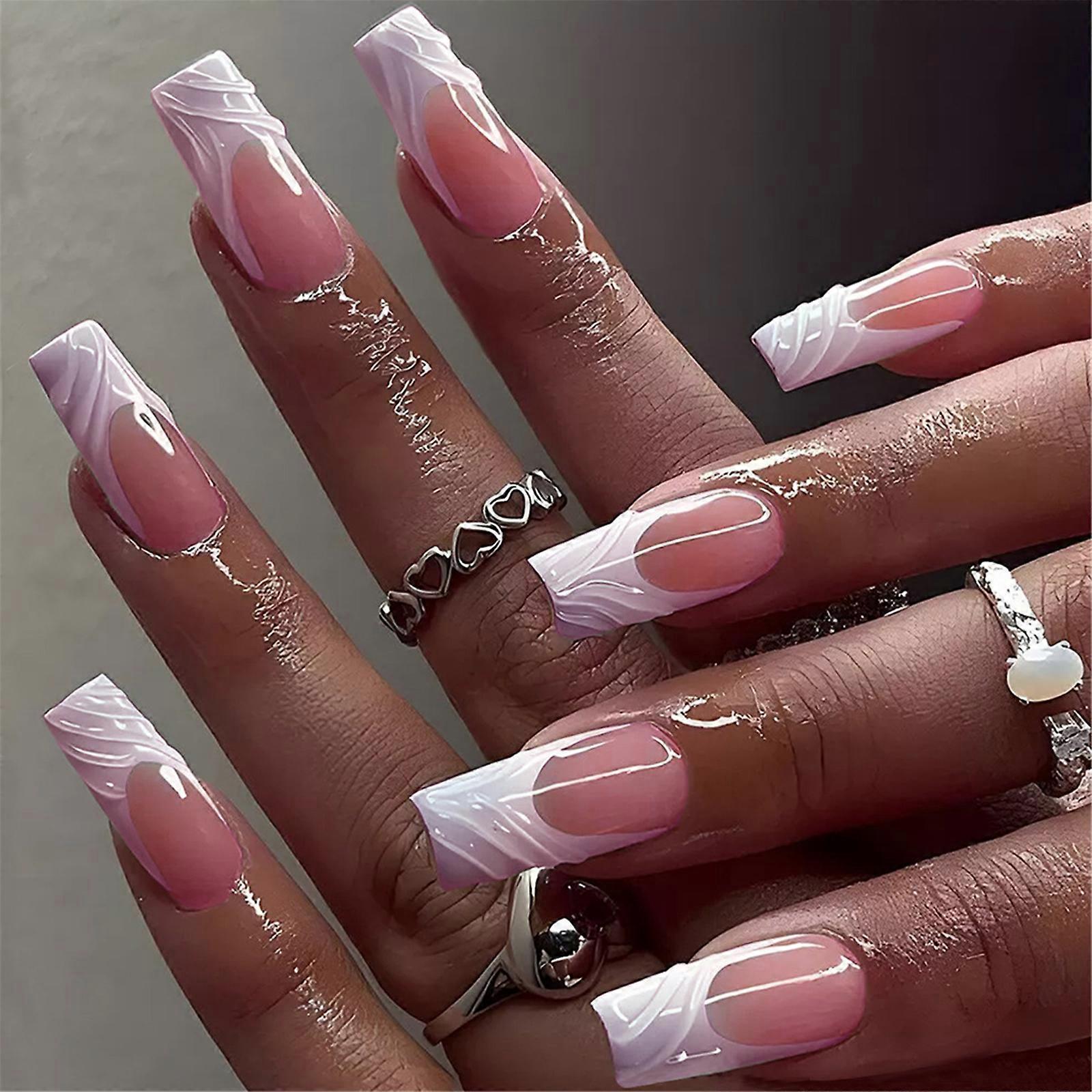 24pcs Elegant Press on Nail Square False Nail with French 3D Stripes Designs Manicure Nail Accesories Quick Application Multicolor