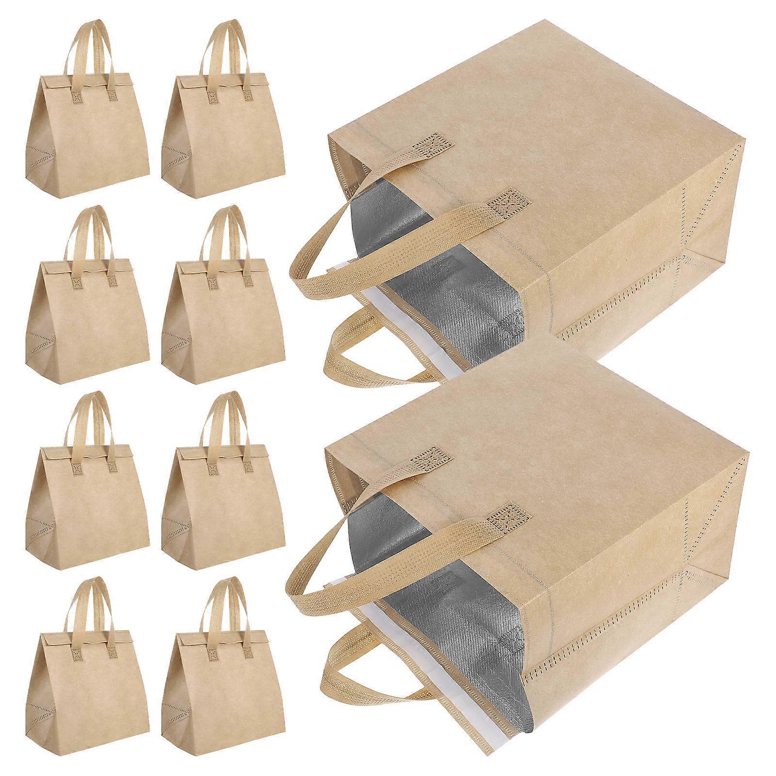 This versatile thermal take-away bag is Ideal for a variety of uses, from food to grocery shopping. The aluminum foil lining provides excellent insulation, keeping your items at the right temperature. The non-woven fabric and kraft paper construction ensure durability and a stylish look. Features -Color:Beige -Material:Non-woven fabric, aluminum film -Size:24.00X24.00X15.00cm/9.43X9.43X5.89in -Effective temperature maintenance: the aluminum foil material effectively maintains the temperature of your food, ensuring it stays warm or cold as needed -Freshness retention: the nonwoven fabric helps retain the freshness of your food, keeping it tasty and enjoyable for longer periods -Easy transport: with a userfriendly handle, this bag is designed for easy transport, making it simple to carry your takeout food and drinks -Multifunctional: this bag is suitable for various takeout items, including hot meals, milk tea, coffee, and cold beverages, providing versatile use -Durable and reusable: unlike paper bags, this bag is durable and reusable, offering a packaging solution Package list: 12 x takeaway insulation bag