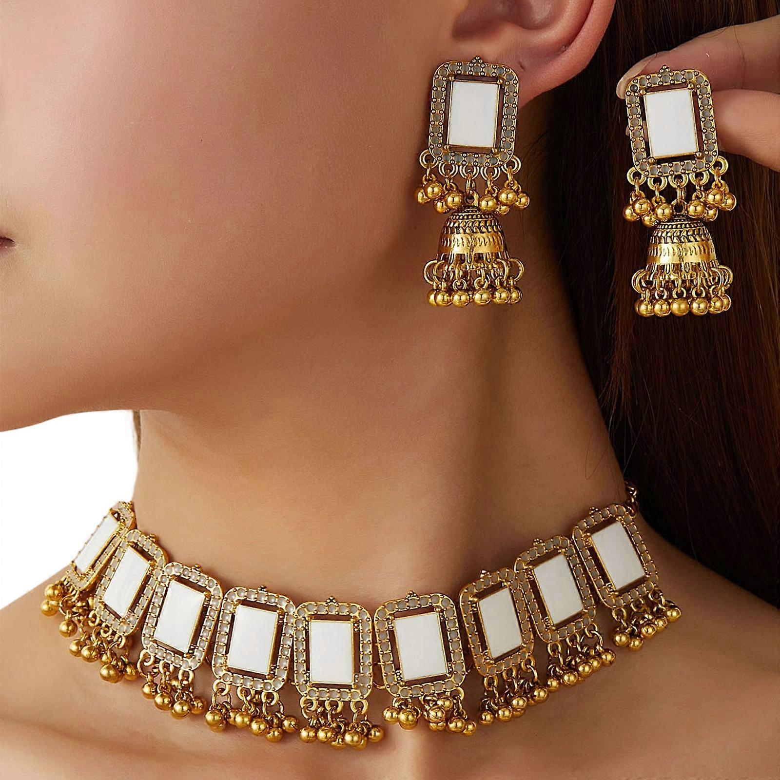 Vintage Ethnic Style Rhinestones Inlaid Bell Tassels Earrings For Women Bohemian Square Geometric Necklace Platinum style