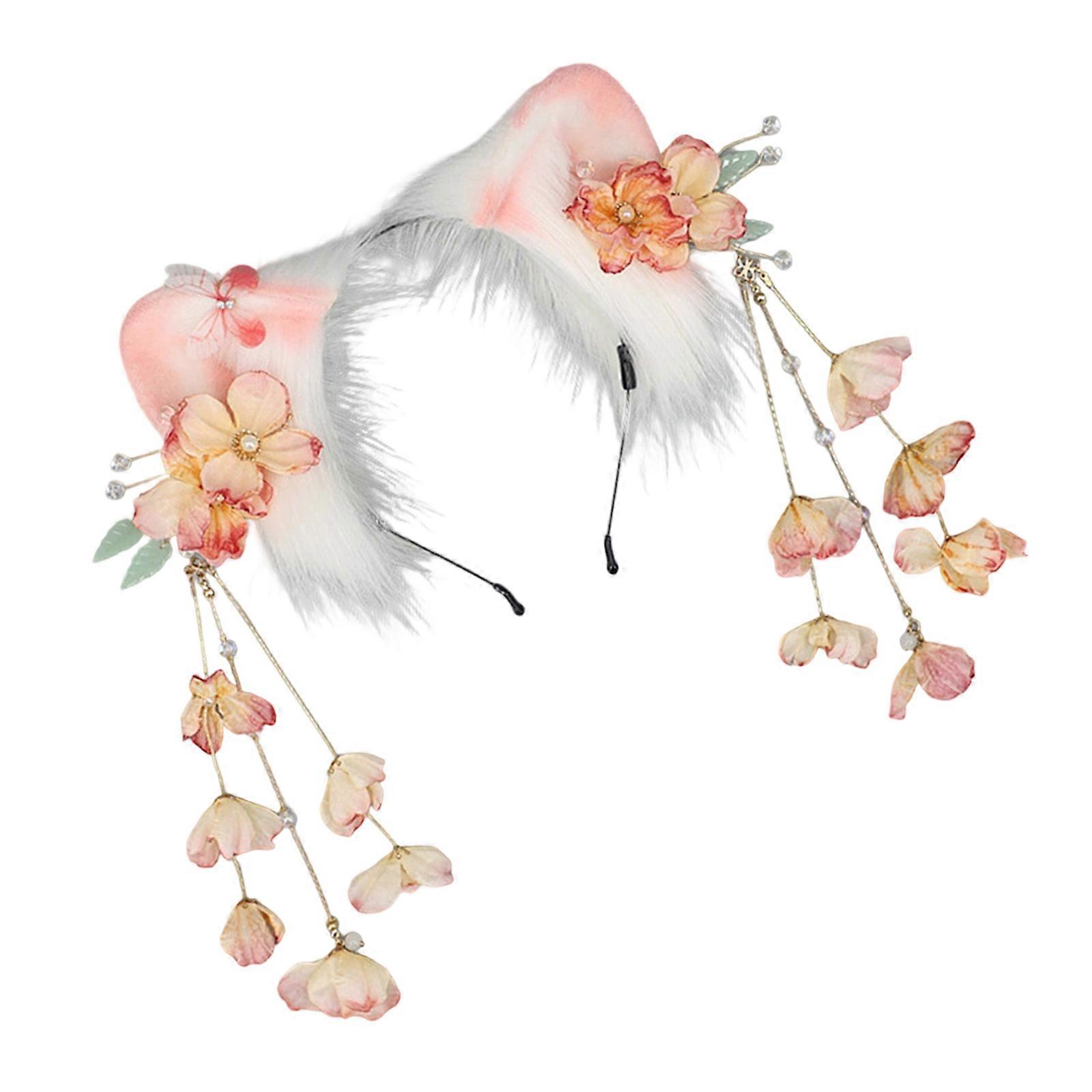 Soft Furry Cats Ear Hairhoop Flower Tassels Dangling Hairhoop For Anime Costume Women Teens Daily and Party Accessories Pink