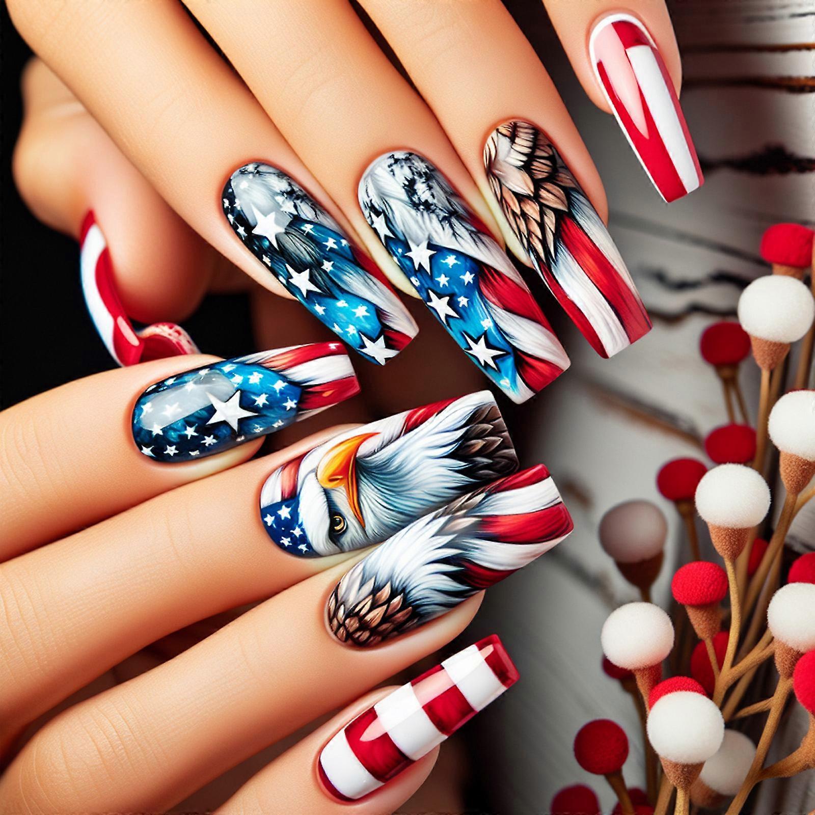 Stylish 24 Pieces Artificial Nail Set With Patriotic Cartoon Designs Perss ons For Independence Day And Special Occasion Multicolor