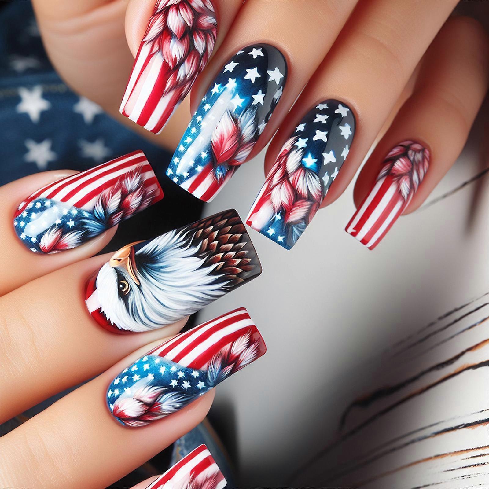 24 Pieces Independence Day Nail Art Set With Star Designs Full Cover Acrylic Press on Nail For Patriotic Celebrations Multicolor